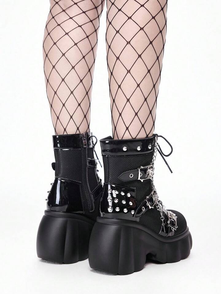 Grunge Punk Damen schwarze Plateau-Ankle-Boots mit rundem Zehenbereich, Gothic-Punk-Stil, mit dunklen Nieten, Doppelschnalle, Totenkopf-Nieten, Ketten und Kreuz-Riemen, modisch