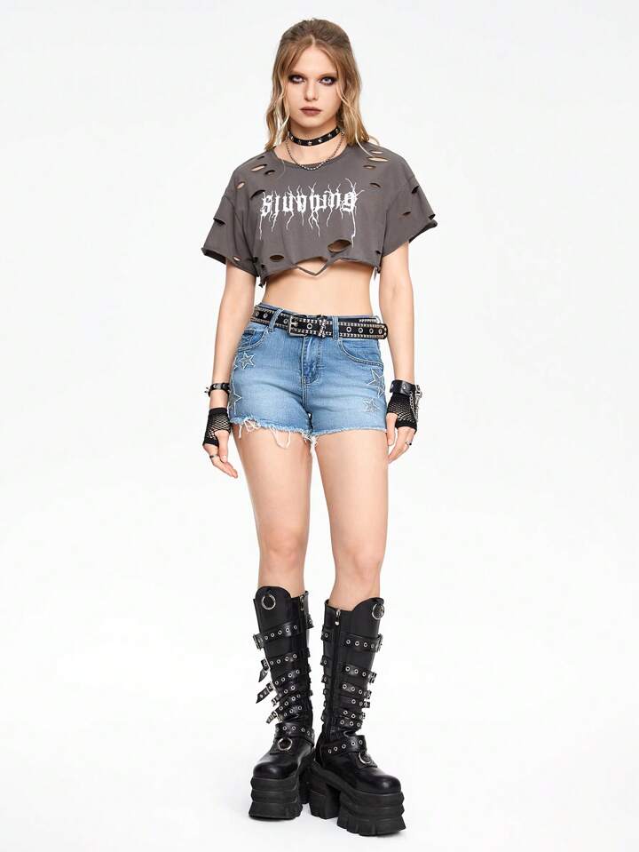 Grunge Punk Lässige Damen Denim Shorts mit Stern Stickerei und Fransen Saum