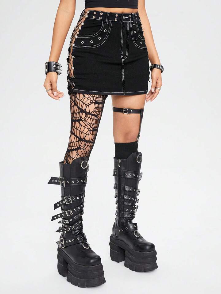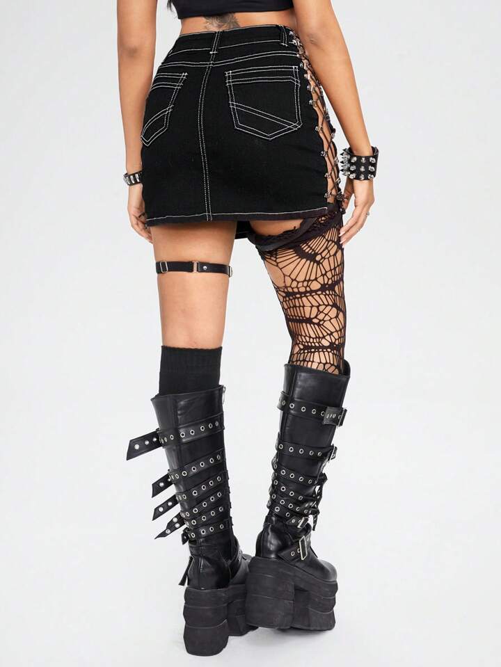 Grunge Punk Damen Kreuzgurt Cut Out Slim-fit Mini Denim-rock