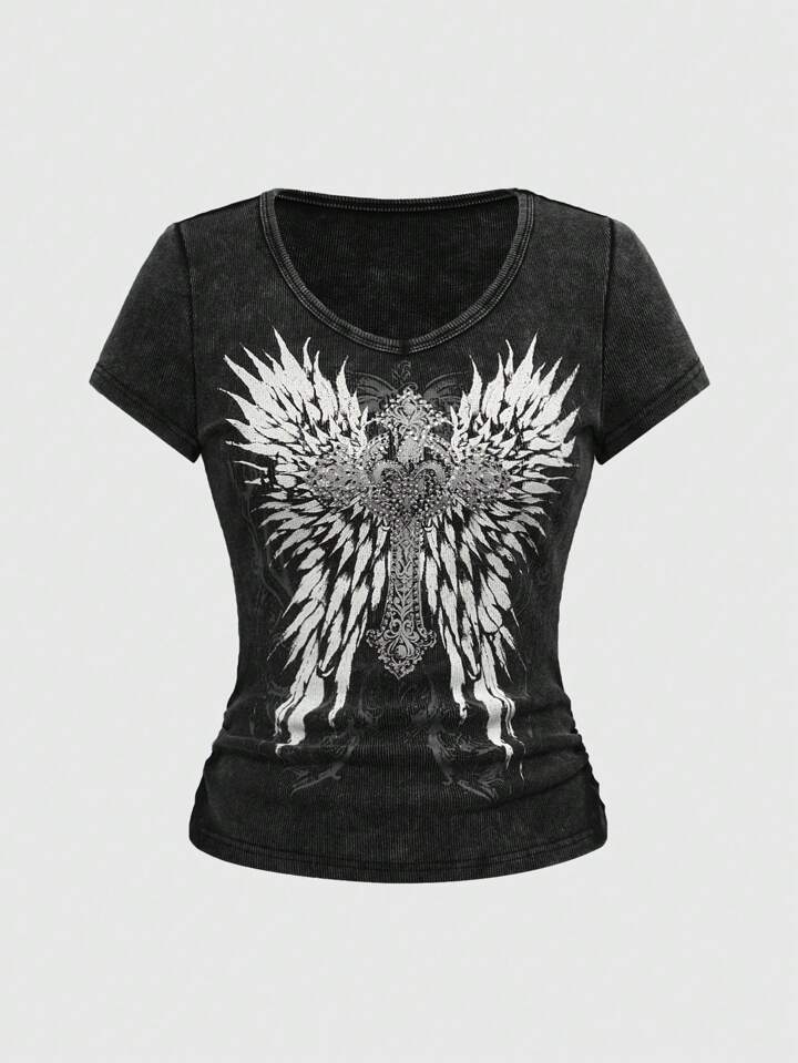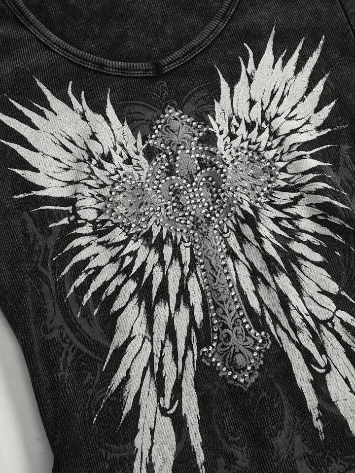 Grunge Punk Damen Kreuz & Flügel Strass-verziertes Figurbetontes T-Shirt
