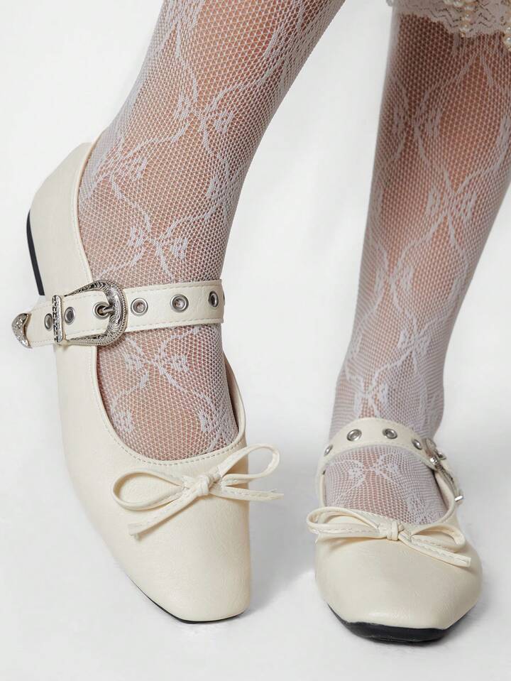 Grunge Punk Damen Dunkel Punk Rock Party geschlossene Zehengurt weiße Loafers, Schleife Dekor Mary Jane weiche Sohle Ballett Flats Frühlings Schuhe