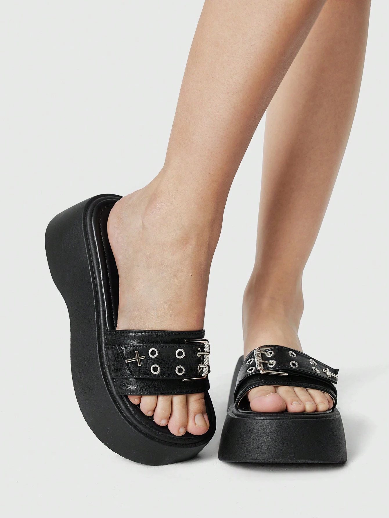 Grunge Punk Damen Gothic Punk Stil Fledermaus Dekor Dicke 6cm Sohle Sandalen, Römische Gürtelschnalle abnehmbare Mules, Plateau Schwarz Punk Rock Millennium Hottie Outdoor Hausschuhe