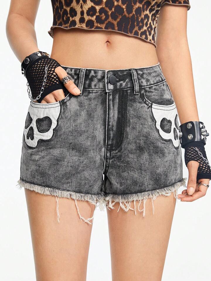 Grunge Punk Gothic Skull Kontrastfarbe Patch Bestickte ausgefranste Denim Shorts für Damen, Sommer