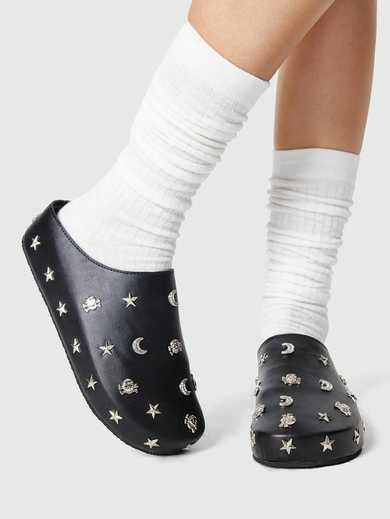 Grunge Punk Damen Gothic Stern & Mond Mule Schuhe, geschlossene Zehe Hohlslipper, Mary Jane Leder-Plateausohle & Keilschuhe, Punk Rock Stil