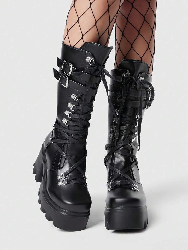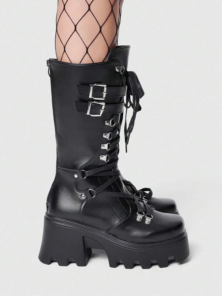 Grunge Punk Damen Stiefel mit Metall-Schnallenverzierung, runder Zehenbereich, mittlerer Absatz 8cm hoch, im englischen Retro-Stil aus PU-Leder in Schwarz, kniehohe Stiefel, geeignet für lässige Herbst- und Wintermode, auch für den Neujahrsfeiertag
