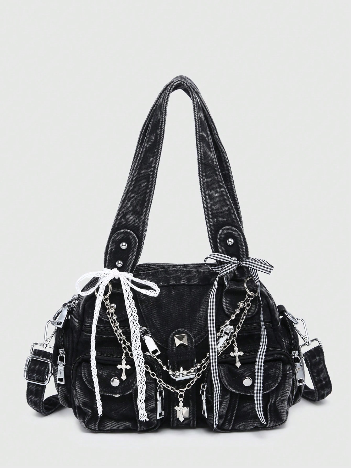 Grunge Punk Damen Retro verwaschene Farbverlauf Kreuz & Herz Anhänger Schleife Dekor Umhängetasche, Große Kapazität Multi-Taschen Umhängetasche