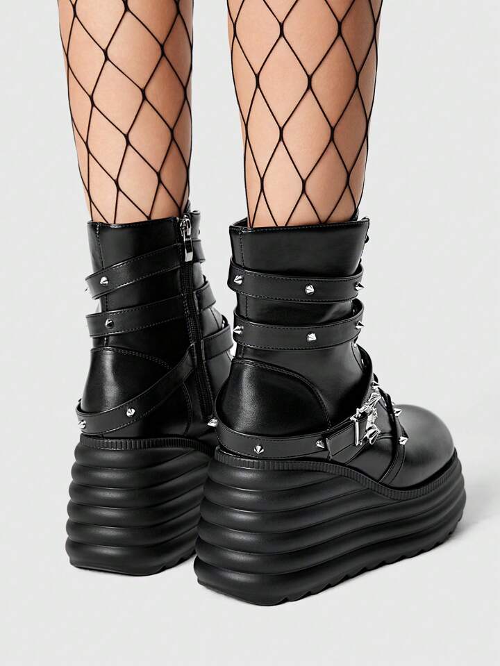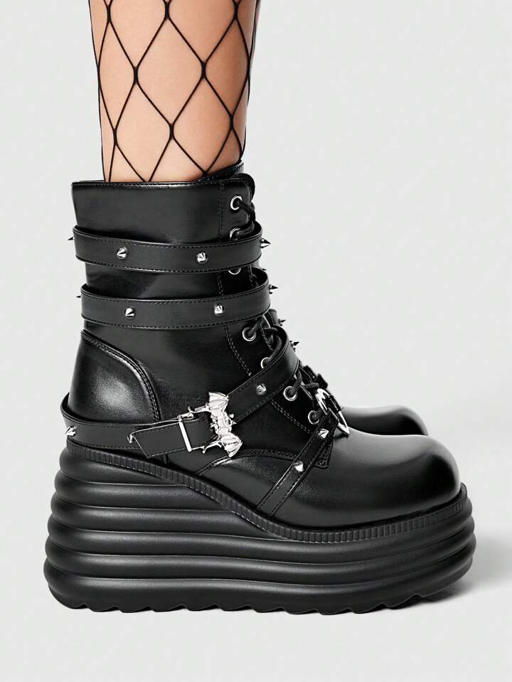 Grunge Punk Damen Nieten Fledermaus Dekor Runde Zehenkappe Dicke Plateausohle Keilabsatz Dunkel Metall Punk PU Schwarz Knöchel Stiefel, Alltagsrock Punk Campus Stil Valentinstag Frühlingssschuhe