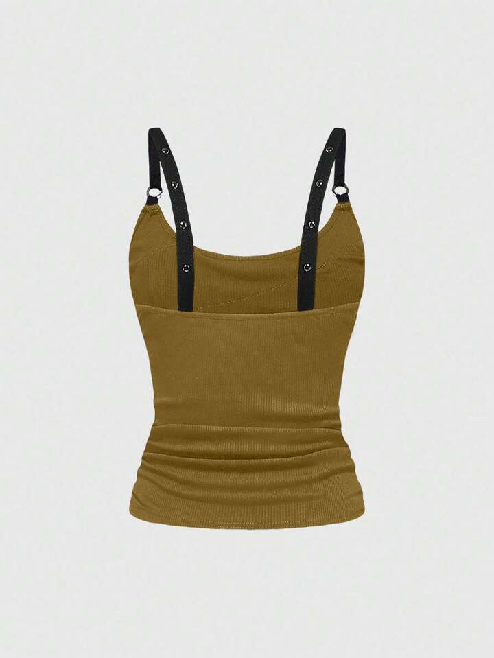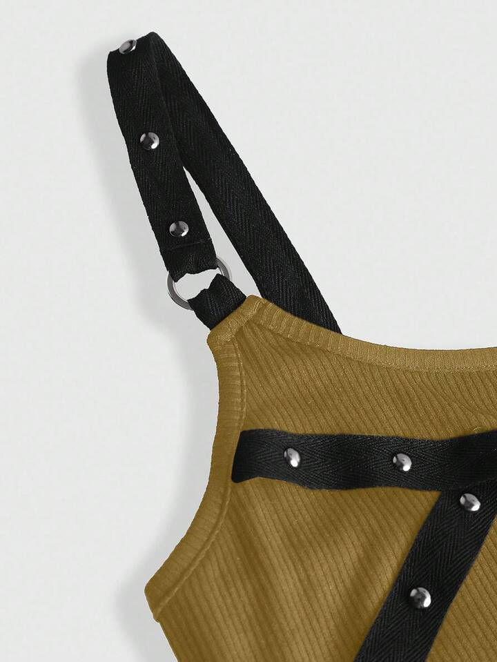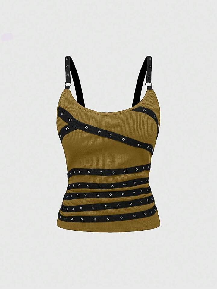 Grunge Punk Ärmelloses, sexy Spaghettiträger-Tank Top mit tiefem Ausschnitt und Nieten, Strasssteinen und Bändern für Damen, geeignet für Sommerstrand, Abschlussfeiern, Ostern, Konzerte, Nashville-Urlaub, Musikfestivals, Rock