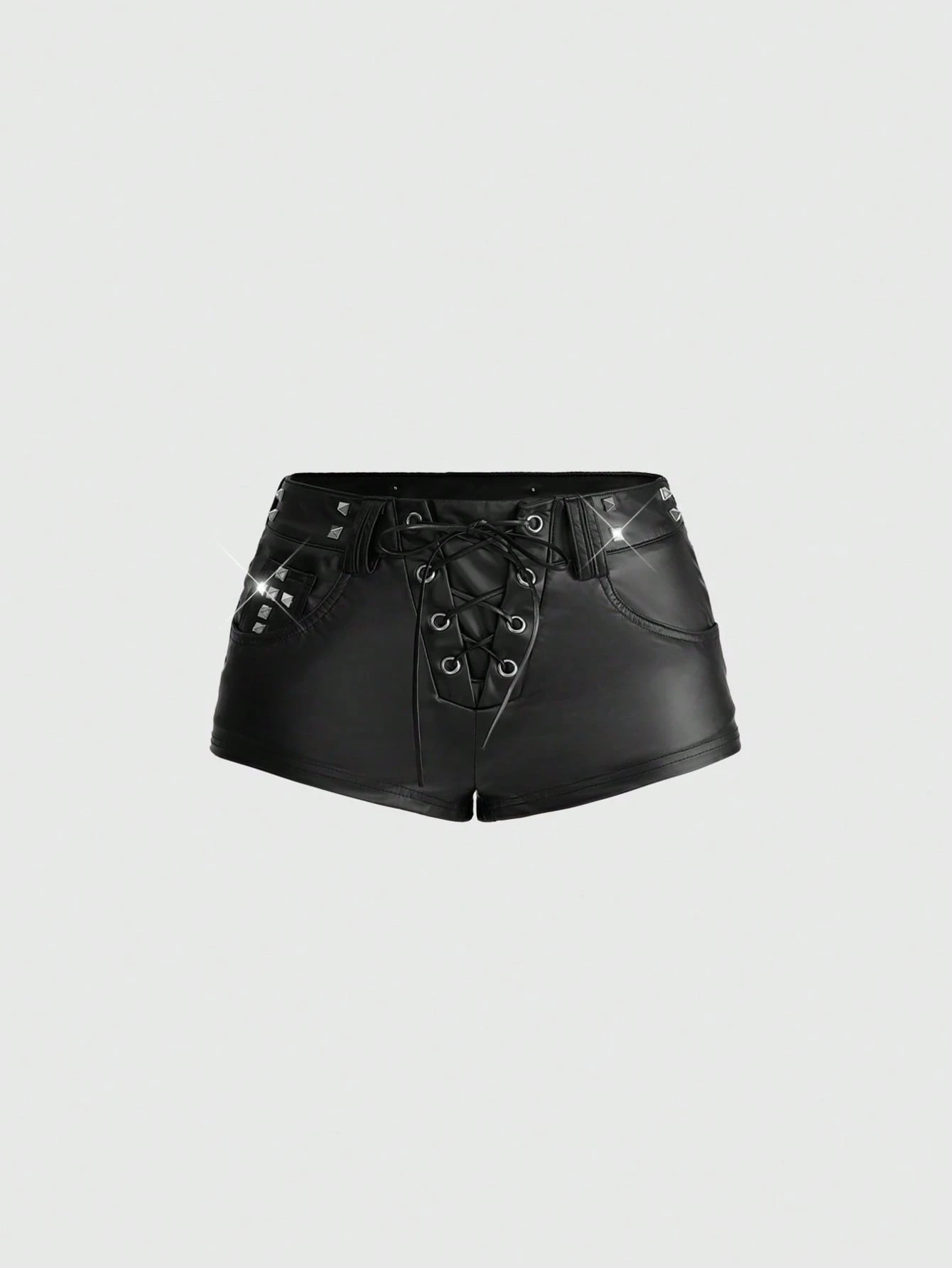 Grunge Punk Damen Ultra Tief Sitzende Mini PU Sexy PUNK Metall Nieten Shorts
