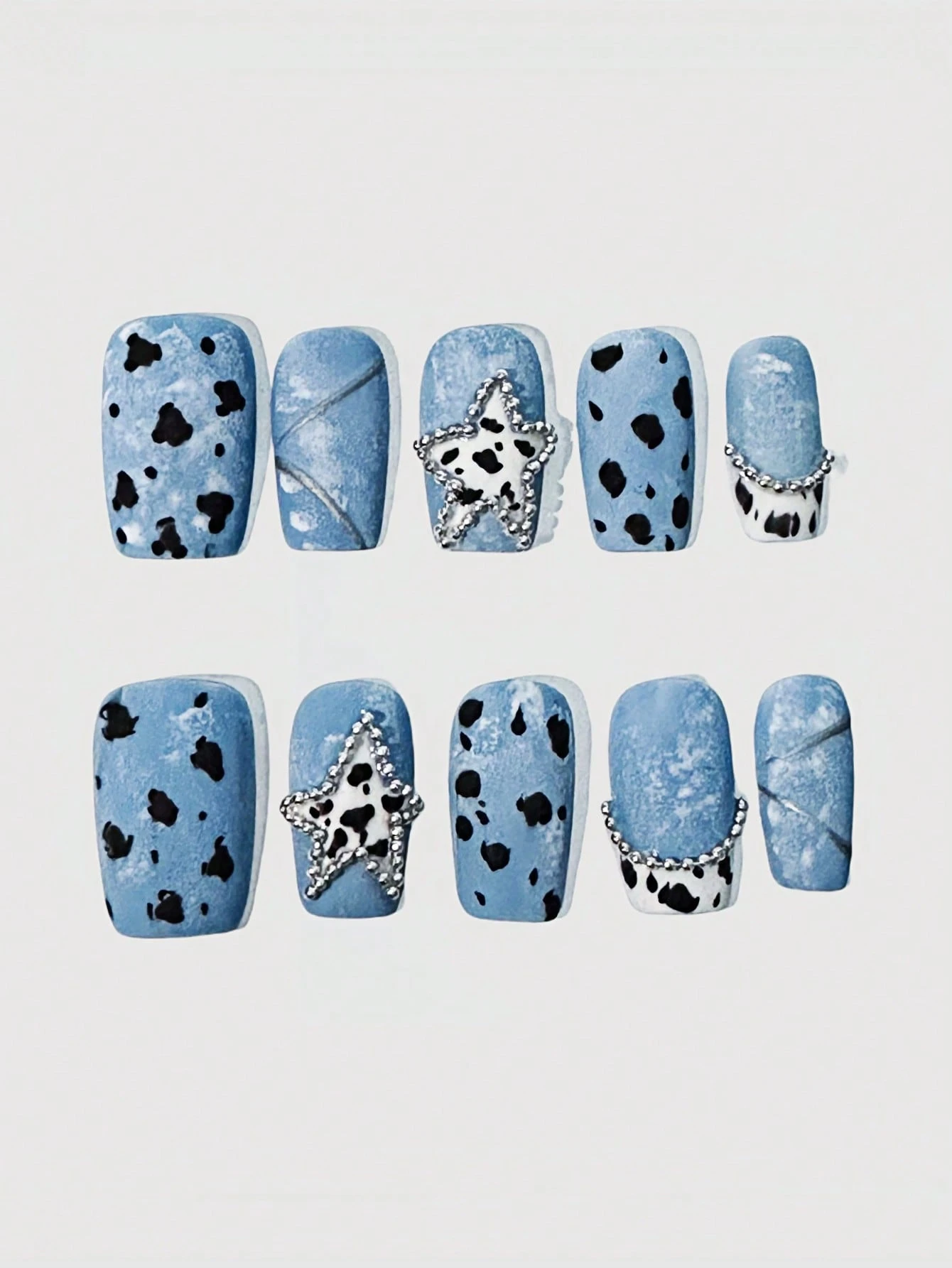 Grunge Punk Y2K süße Leoparden-Muster- und Herz-Muster, blau gestreifte strukturierte quadratische handgemachte Kunstnägel, vintage gepunktetes ästhetisches Set mit Fake-Nägeln, geeignet für Straßenfotografie und Einkaufen