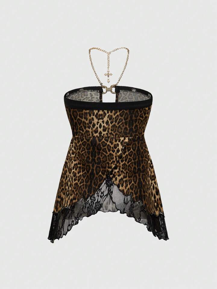 Grunge Punk Y2K Harajuku Metallaccessoire mit Leopardenmuster asymmetrischen Saum Trägertop