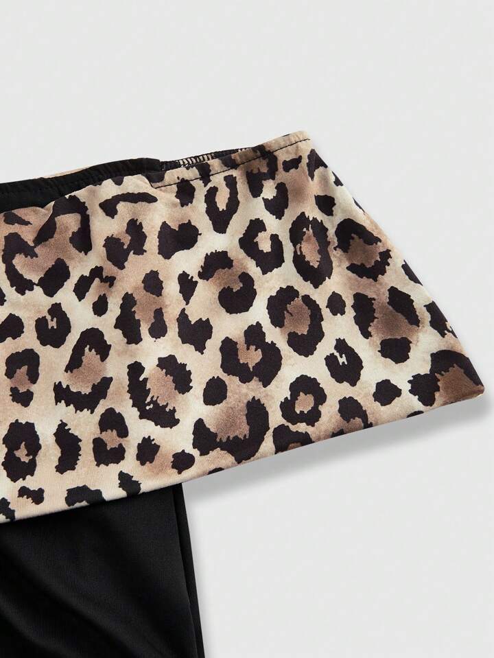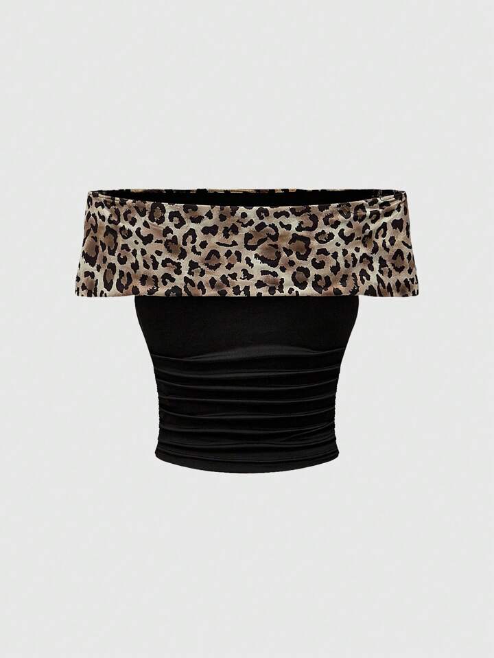 Grunge Punk Y2K Hot Girl Leoparden-Muster Crop Top mit Kragen, Taillenraffung und rüschendetails, Off-Shoulder Ausschnitt