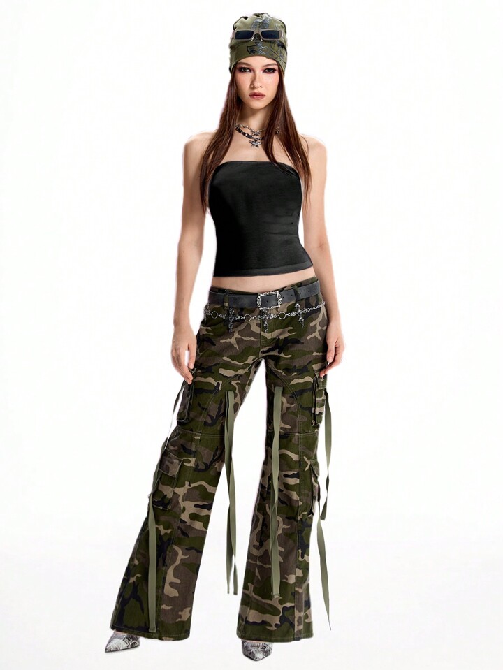 Grunge Punk Y2K-Mode taillentiefe, sexy, vintage gewebter Gürtel, ausgewaschene Camouflage-Jeans mit geradem Bein