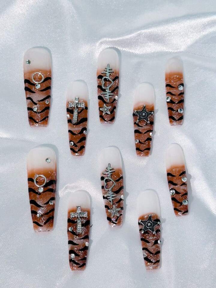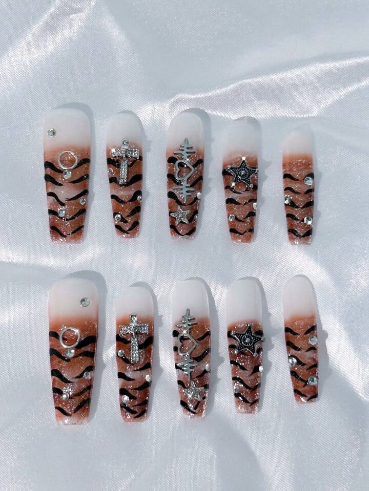 Grunge Punk Y2K Punk Chic Leopardenmuster Metall Stern, Herz, Kreuz lange quadratische handgemachte Falsche Nagel Spitzen, geeignet für Straßen-, Einkaufs-Anlässe