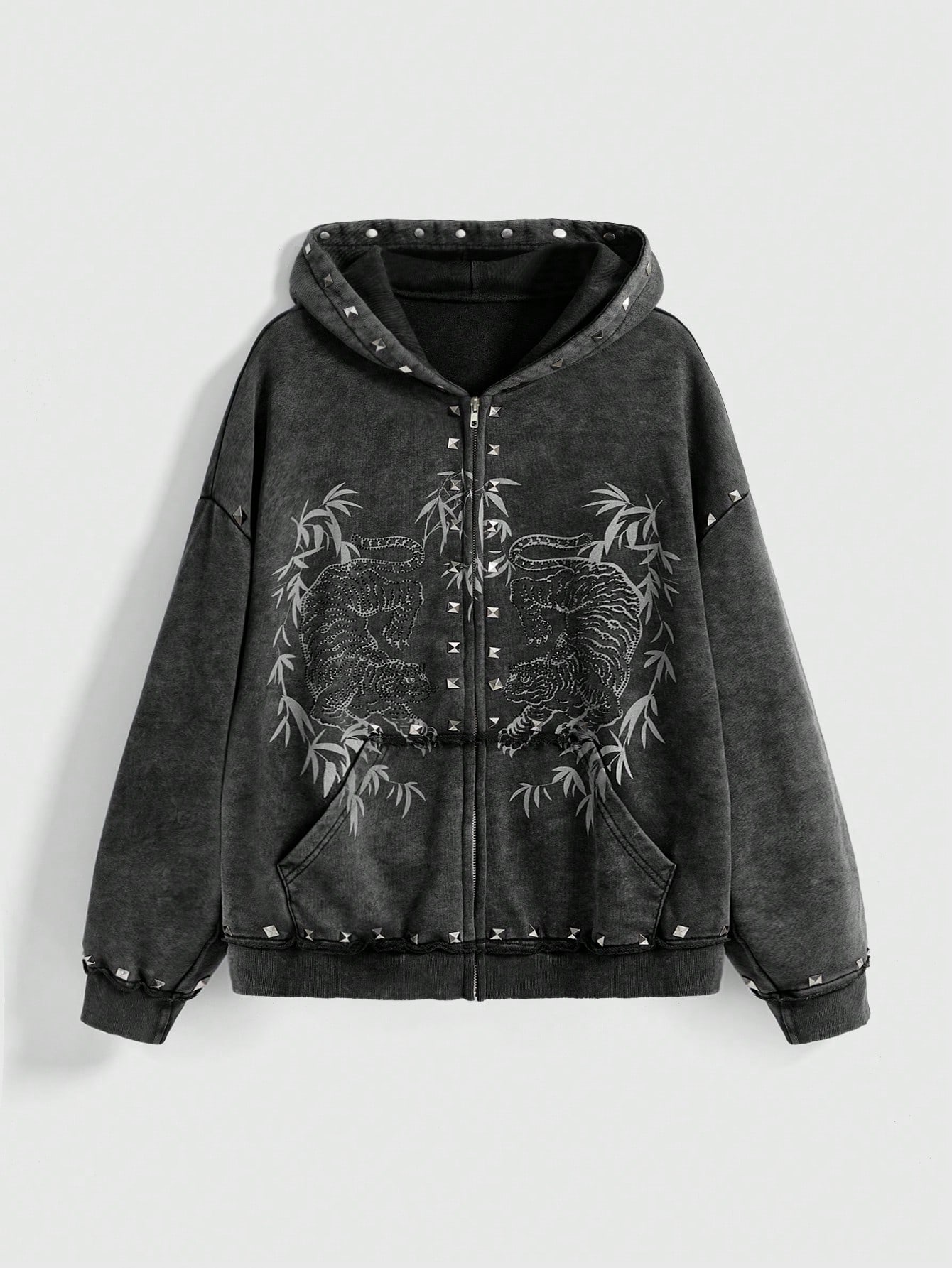Grunge Punk Y2K Punk Nieten Design Bambus Blatt Tiger Muster Oversized Damen Sweatshirt