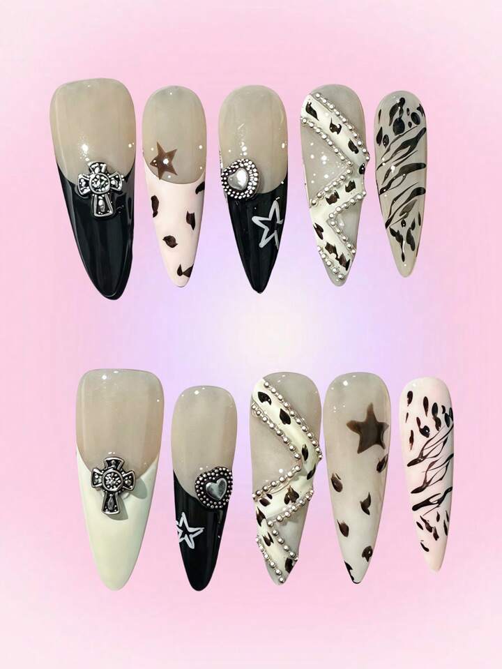 Grunge Punk Y2K Punk Style Leopard Muster, Stern, Kreuz, Metallherz, gepunktete handgemachte Press-On Nagelspitzen, Wild Western Retro Abnehmbare Nagelkunst