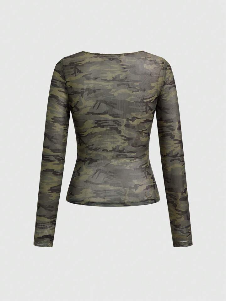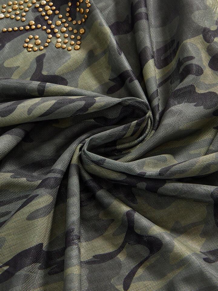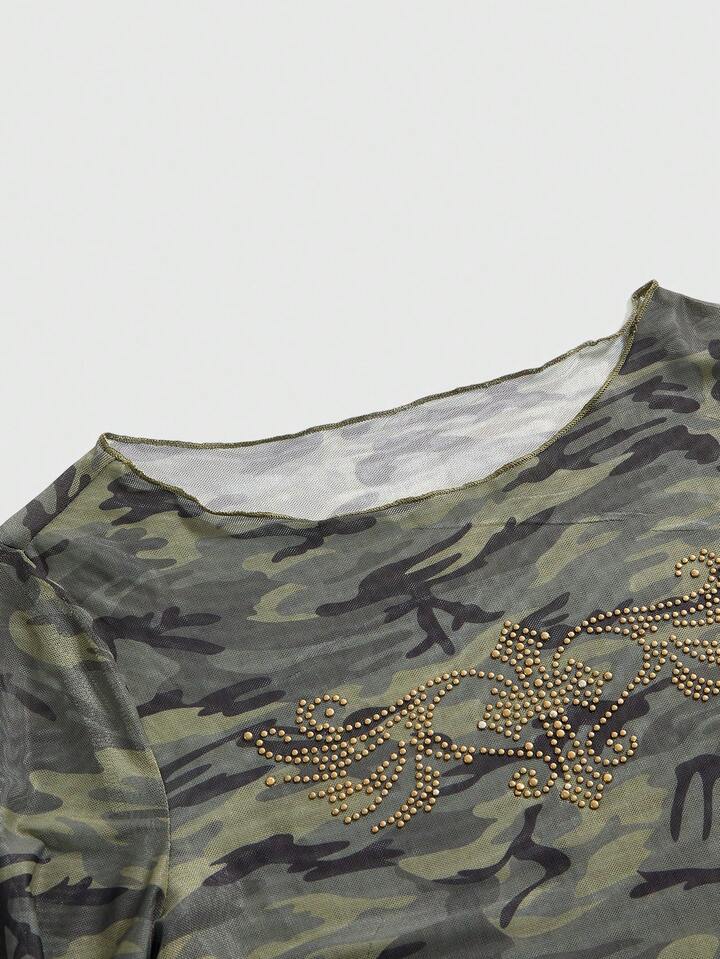 Grunge Punk Y2K Retro Camouflage Mesh Cross Wing Strass verzierte figurbetonende Langarm Bluse für Frauen