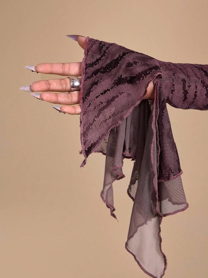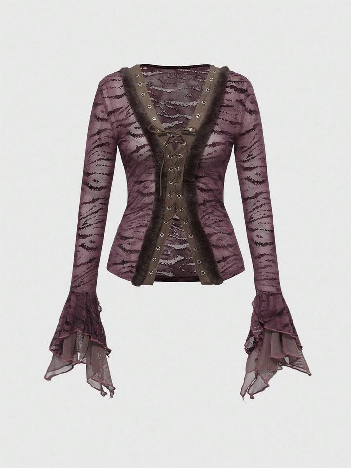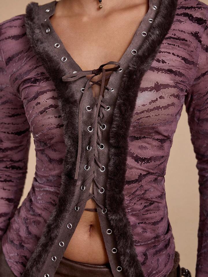 Grunge Punk Y2K Retro Sexy Flockiges Patchwork Pelziges Schnürdesign Kurzes Top mit Glockenärmeln