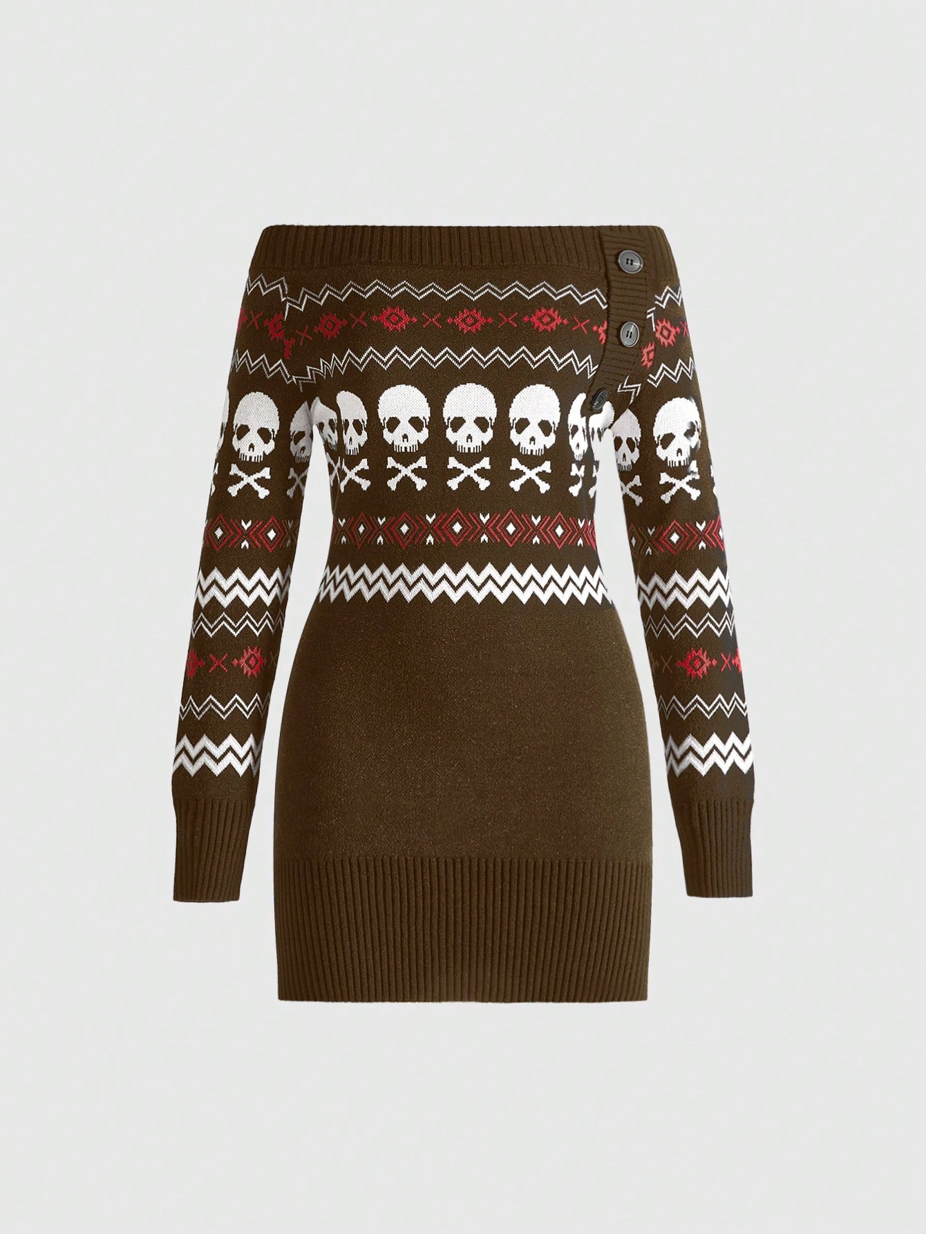 Grunge Punk Y2K Retro Sexy Totenkopf Grafik Off-Shoulder Pulloverkleid für Frauen