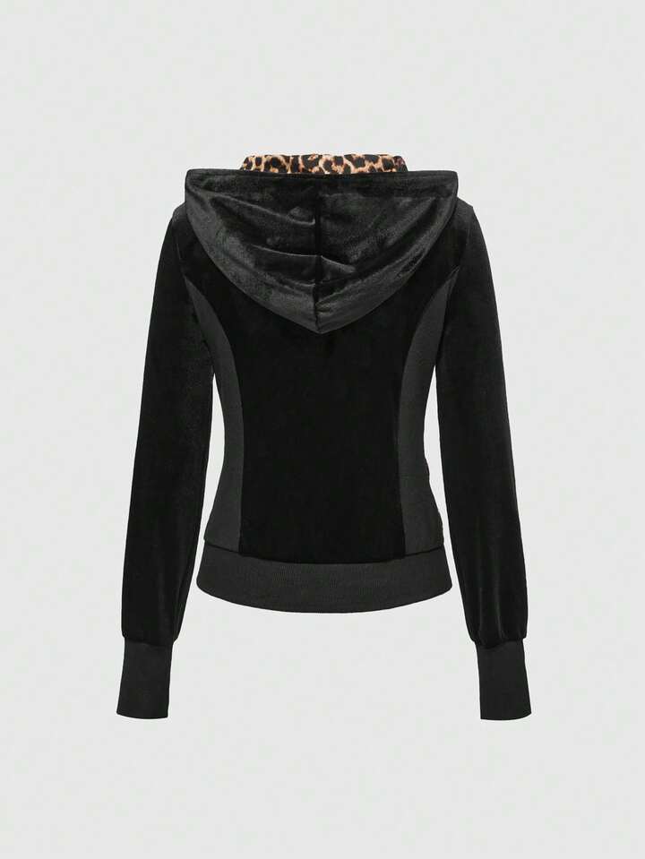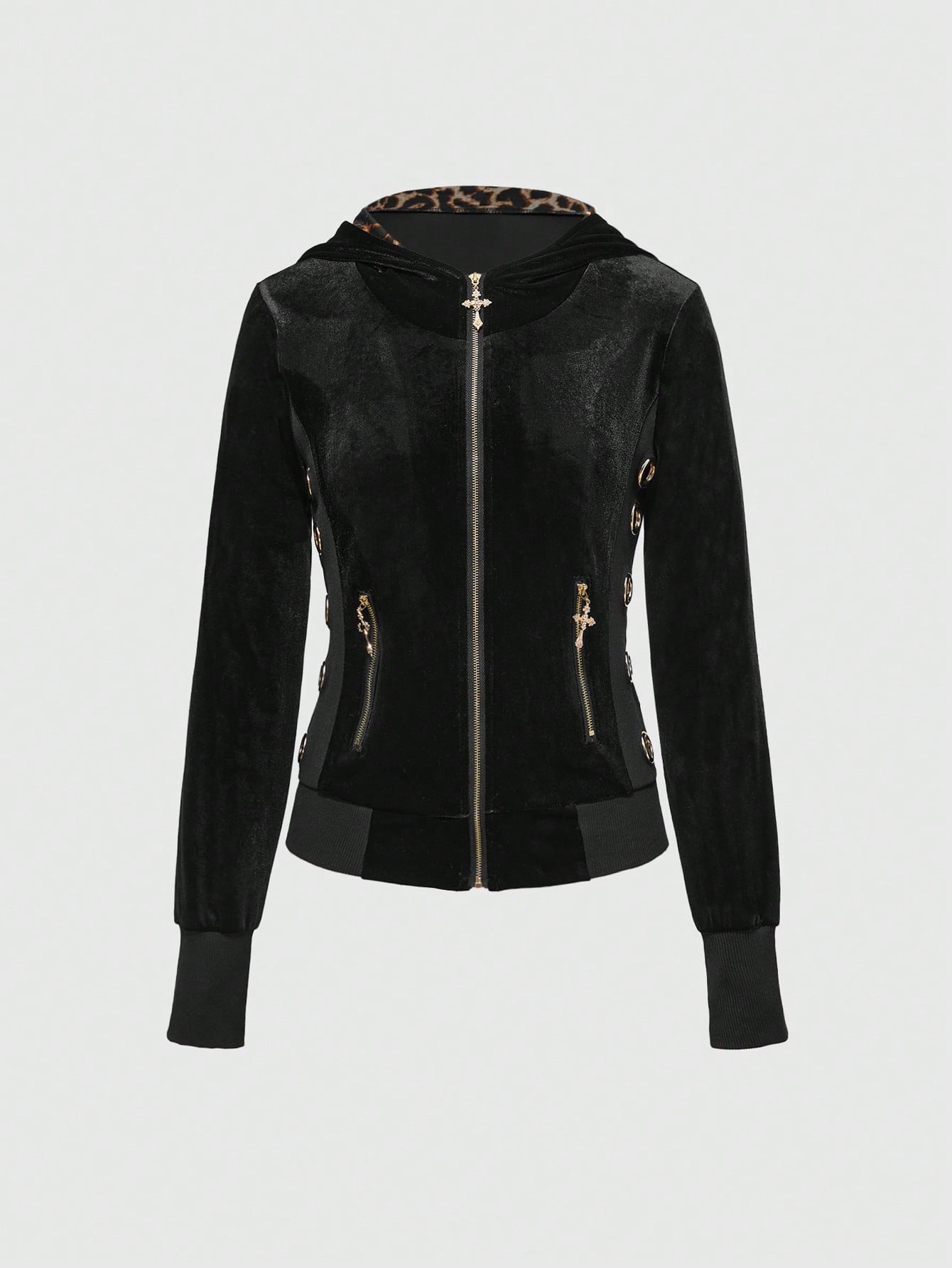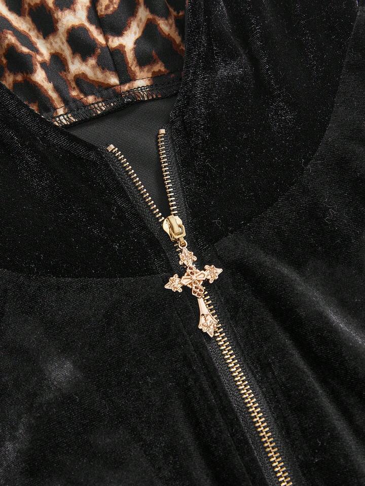 Grunge Punk Y2K Retro Sexy Samt Leopard Patchwork Große Creolen Metall Ösen Reißverschluss Damen Jacke