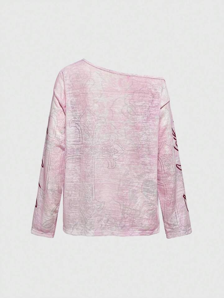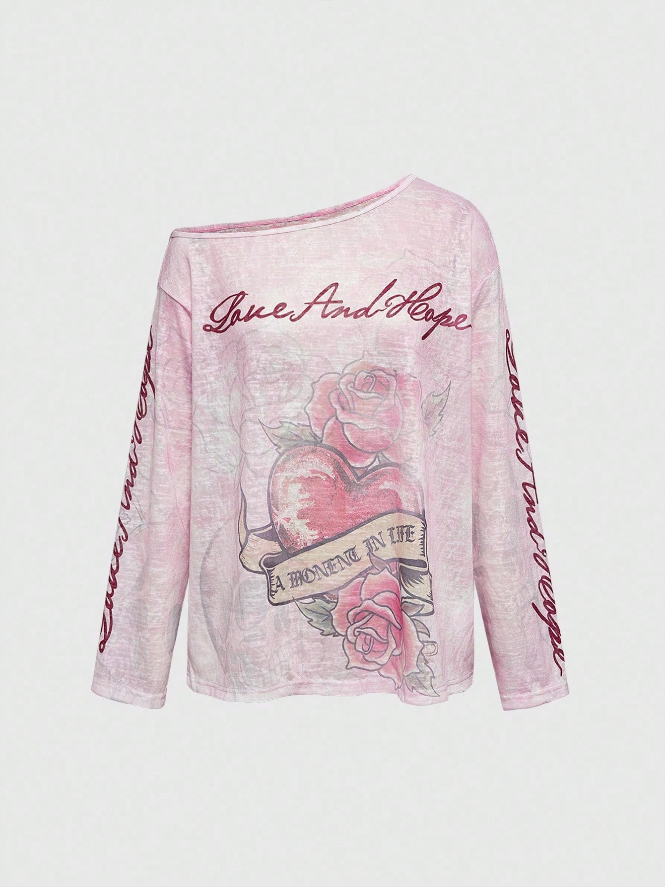 Grunge Punk Y2K Retro Damen Rose & Herz Faux Tattoo VintagMusterck Loose FiOff-Shoulderes Langarm T-Shirt für Damen
