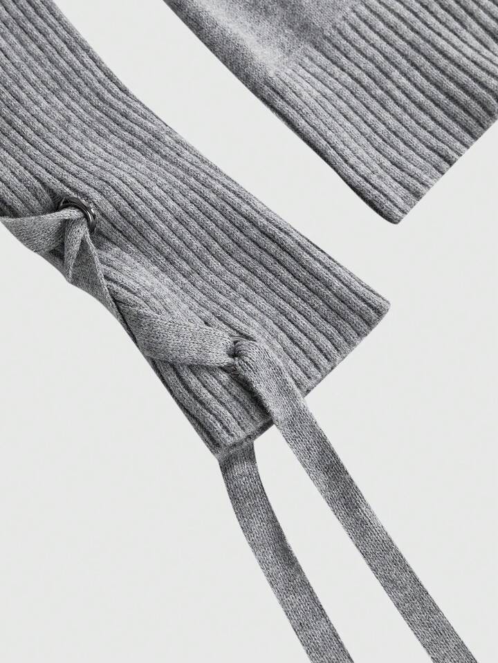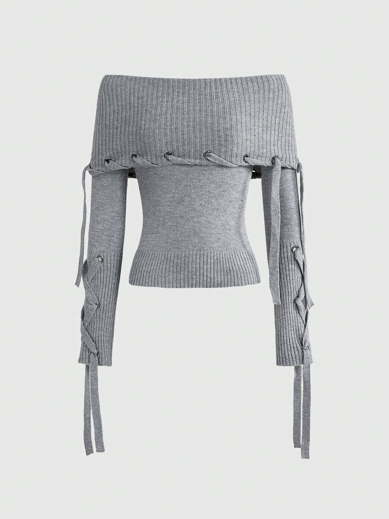 Grunge Punk Y2K-Stil grauer Off-Shoulder Pullover mit Metallosendesign und Schnürung