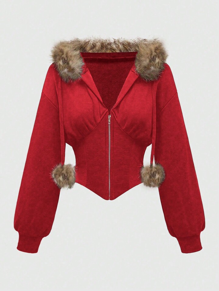 Grunge Punk Y2K Subkultur Retro Taillierter Kapuzenpullover mit Leoparden-Muster und flauschigem Kragen für Frauen