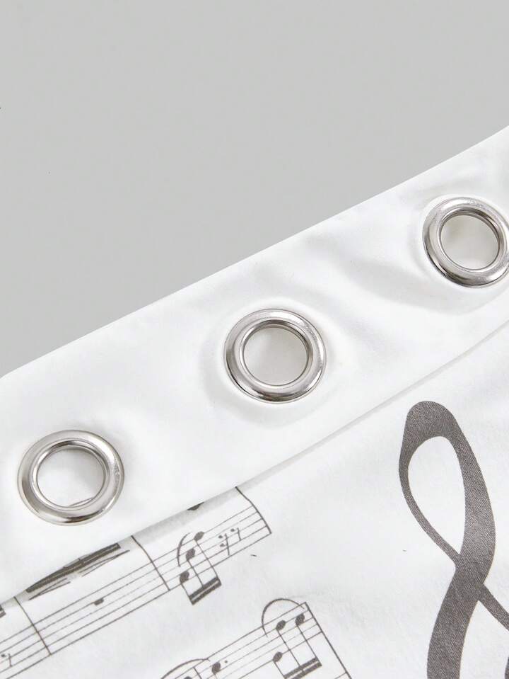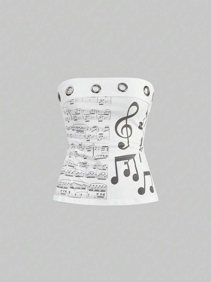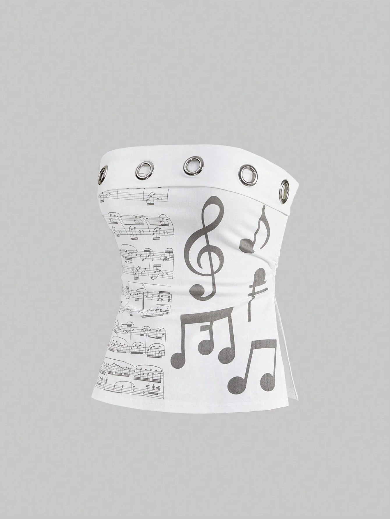 Grunge Punk Y2K Subkultur eng anliegendes Top mit Noten-Muster, Metallösen-Saum mit Schlitz Design für Frauen