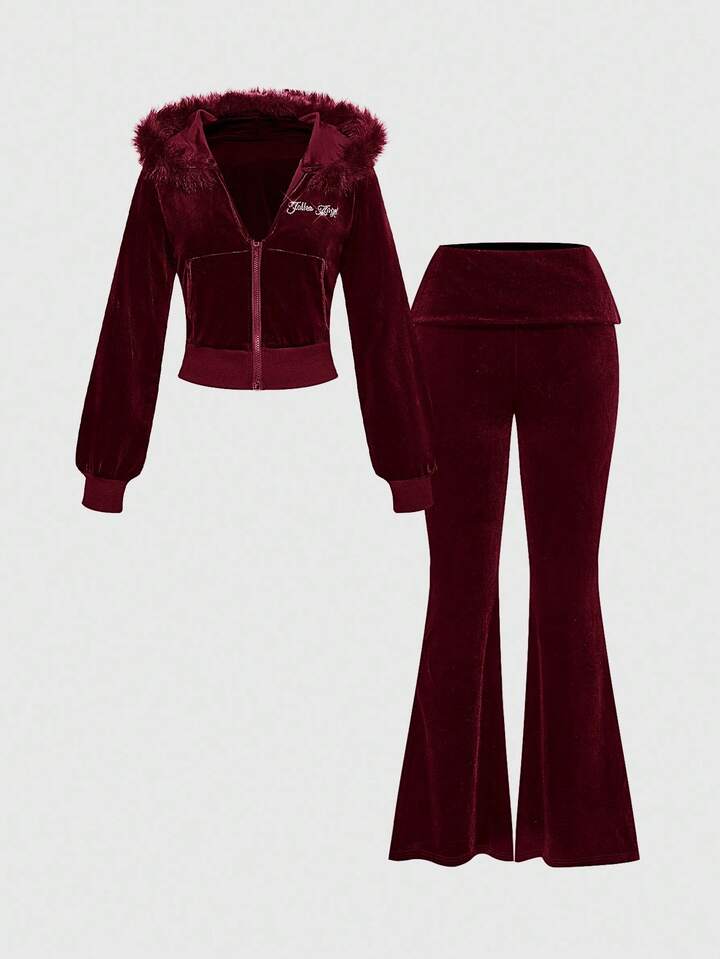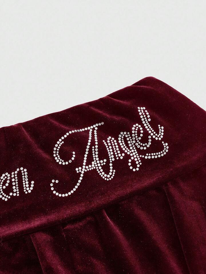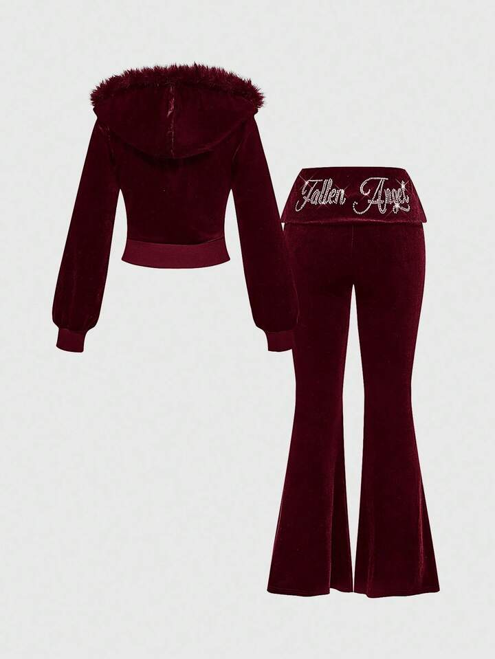 Grunge Punk Y2K Samt Strass Grafik Crop Hoodie & Schlaghose mit tiefer Taille 2-teiliges Set für Frauen