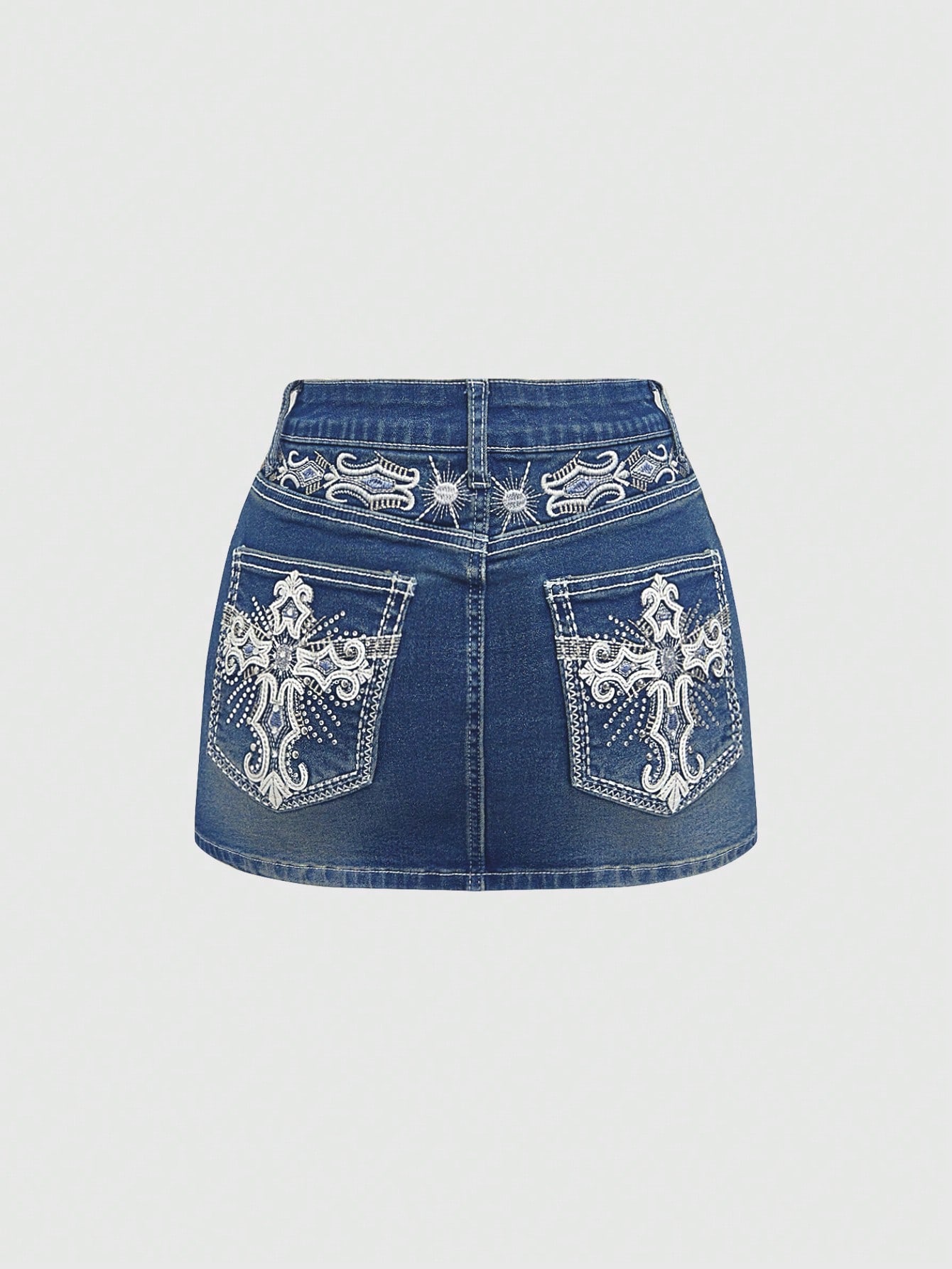 Grunge Punk Y2K Vintage Millennium sexy Körperformende Mini-Rock mit Tasche, Kreuz- und Flügel-Stickerei (inklusive Leggings)