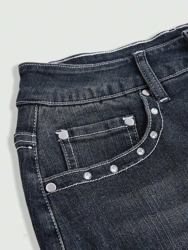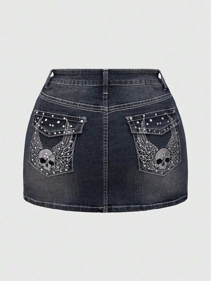 Grunge Punk Y2K Vintage Stil Damen enge Mini Denim Rock mit Taschen, Muster mit Strass-Totenkopf und Flügeln, Sommeroutfit