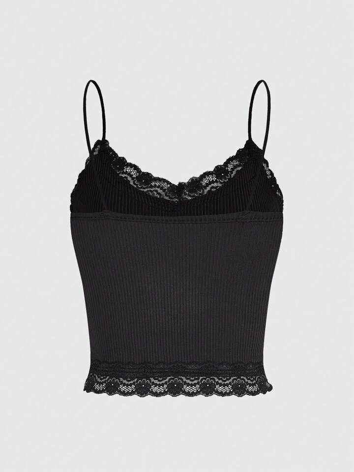Grunge Punk Y2K-Stil sexy schwarzes gestricktes Crop Cami Top mit Strass-Buchstabendruck, Spitzenbesatz und geripptem Design, Schule