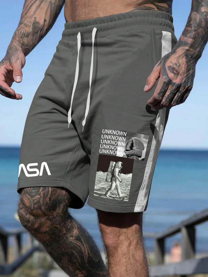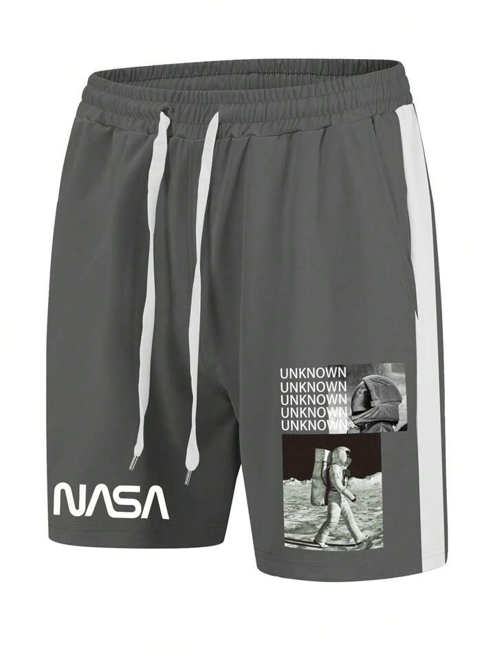 Männer Shorts mit Astronaut und Buchstaben Grafik, Tunnelzug,