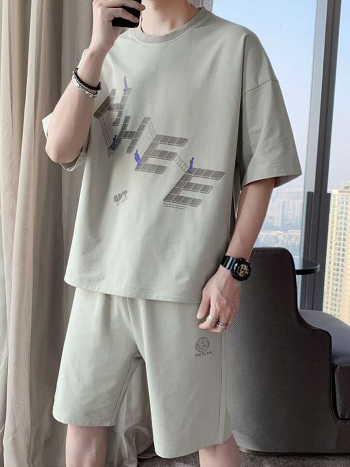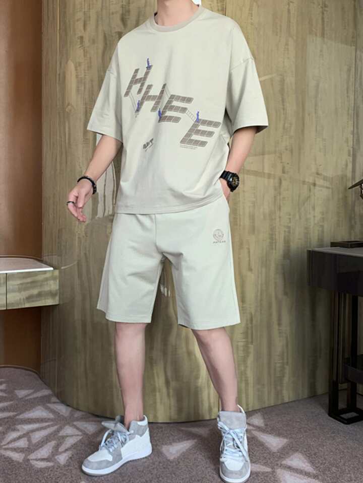 Männer Drop Shoulder T-Shirt mit Figur & Buchstabe Grafik & Shorts mit Ausdruck Muster