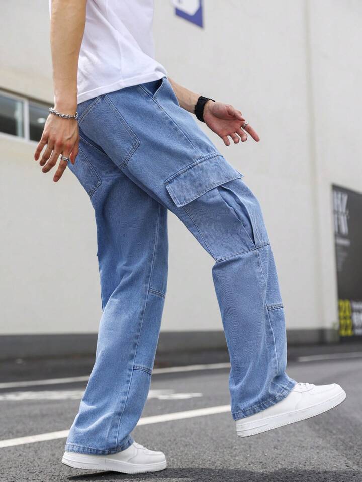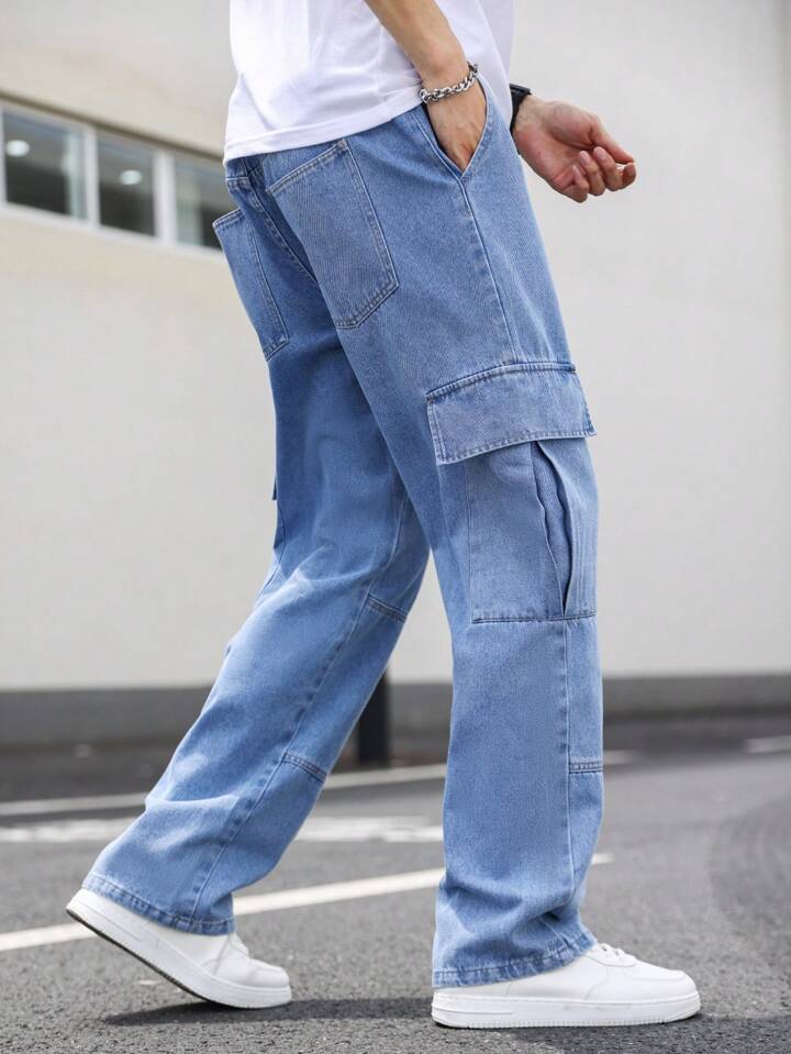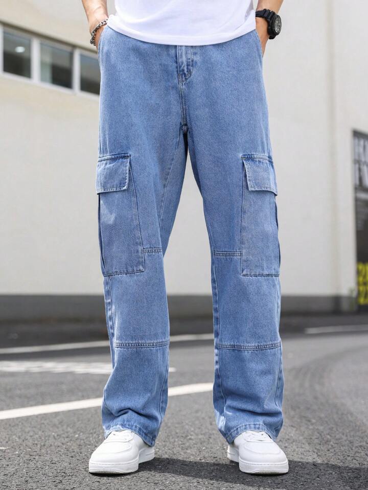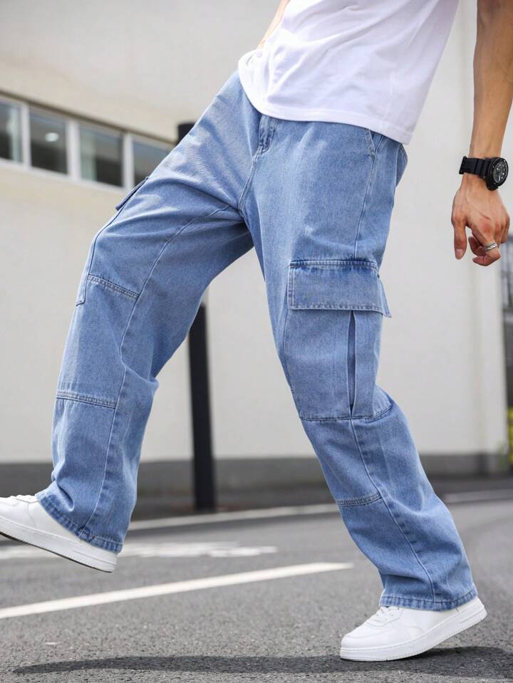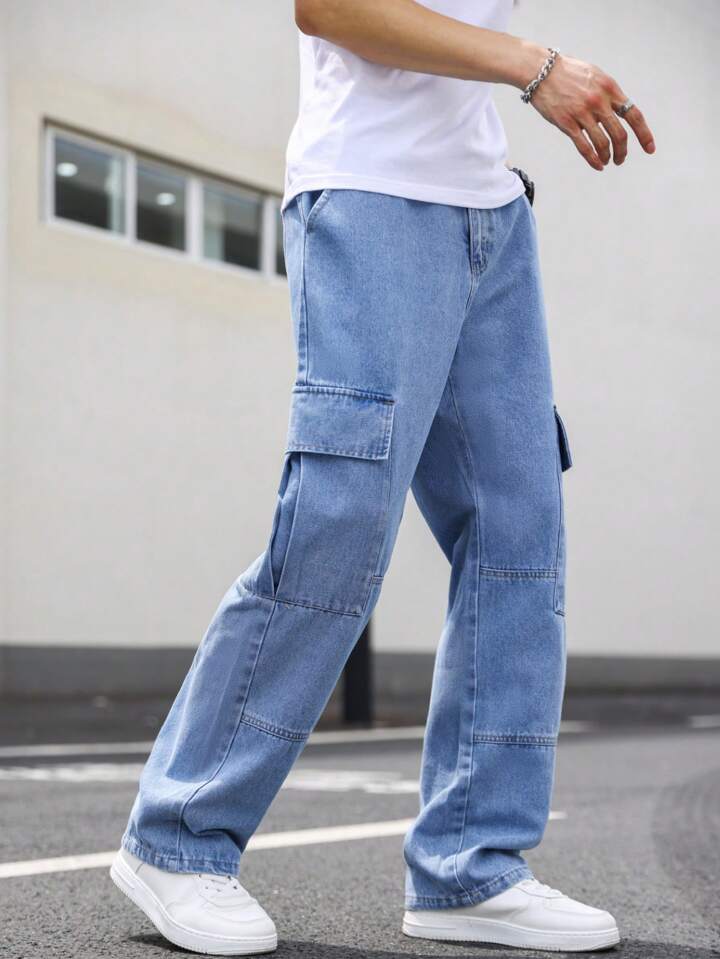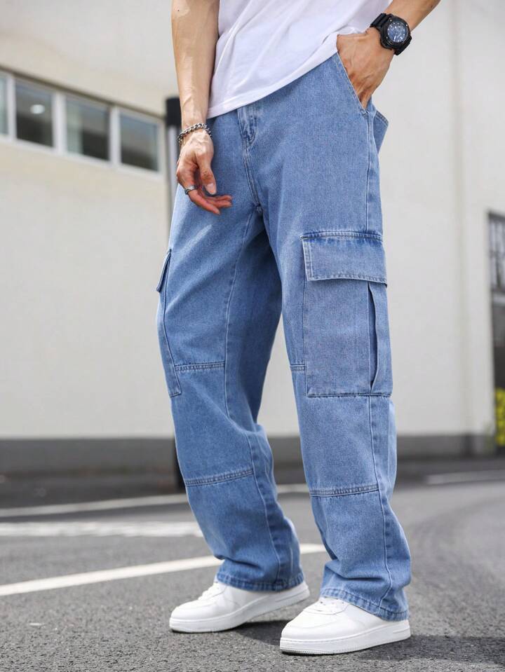 Herren Lässige Cargo Jeans mit Klapptaschen an den Seiten, schlichte lange weite navy blaue verwaschen Cargo Jeans, als Geschenk für Ehemann oder Freund