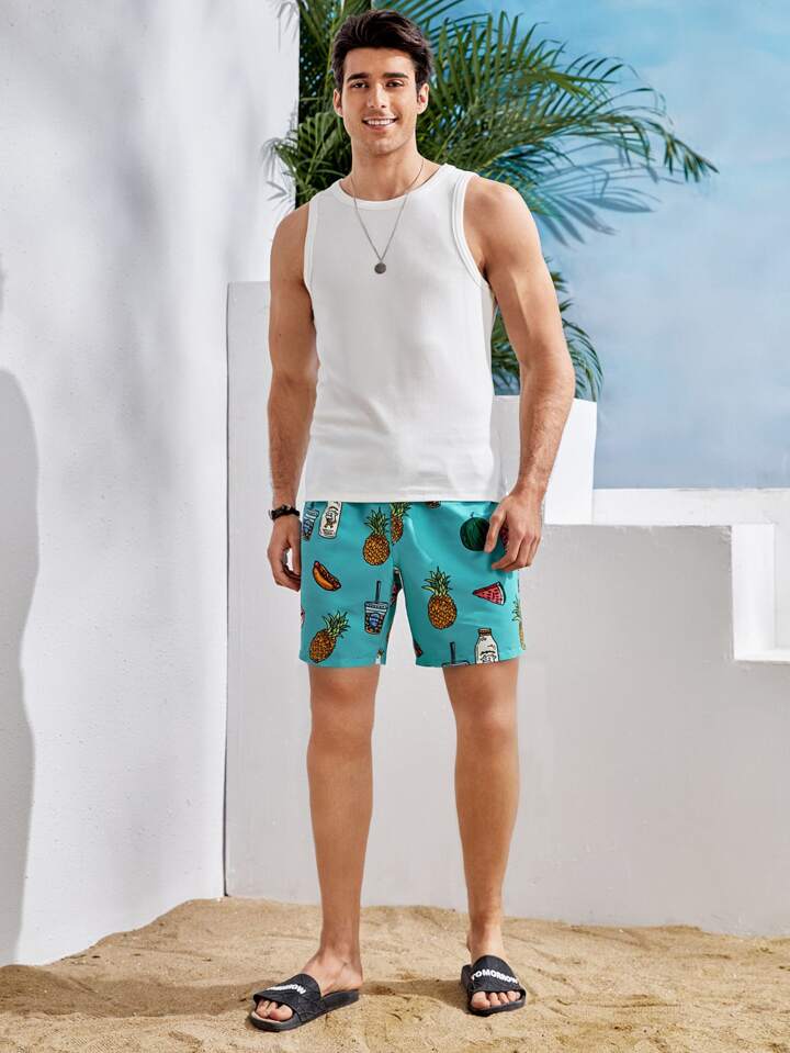 Herren Oberschenkelfreie Badeshorts mit Früchte- und Lippen-Grafik-Muster, für Strand, Urlaub, Hawaii