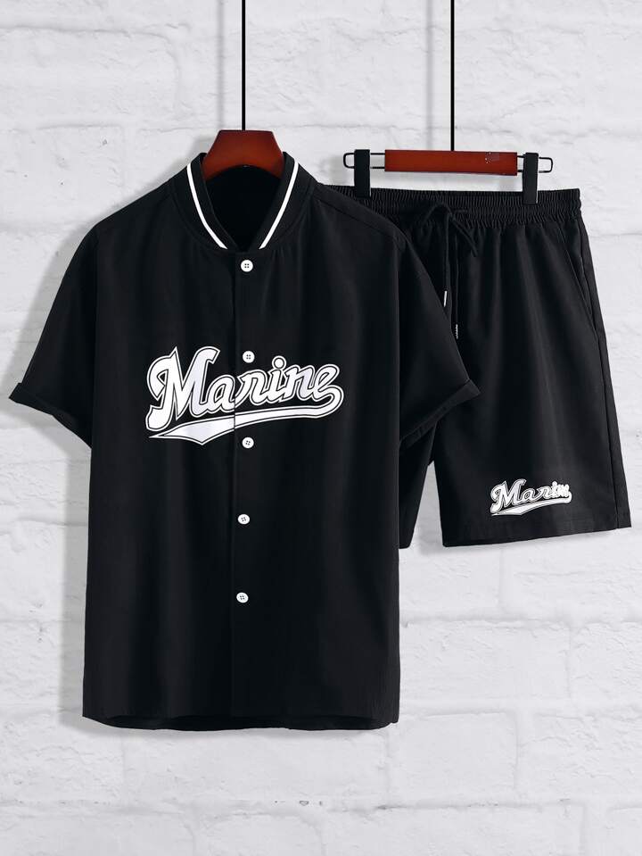 Männer Buchstaben Grafik, Kontrastkragen, Shirt & Shorts