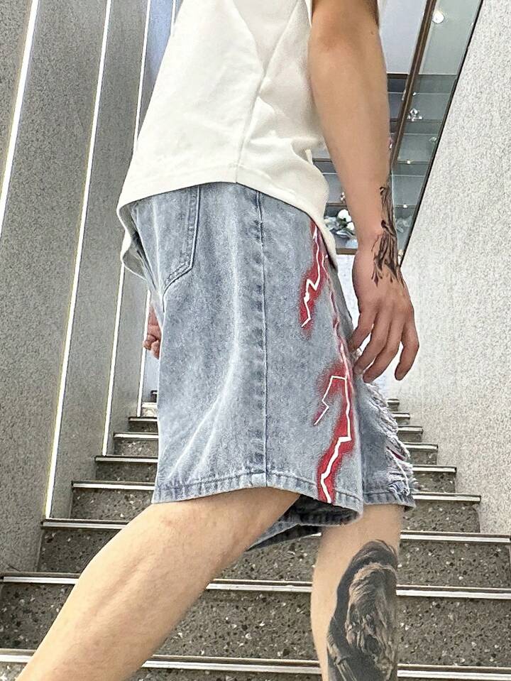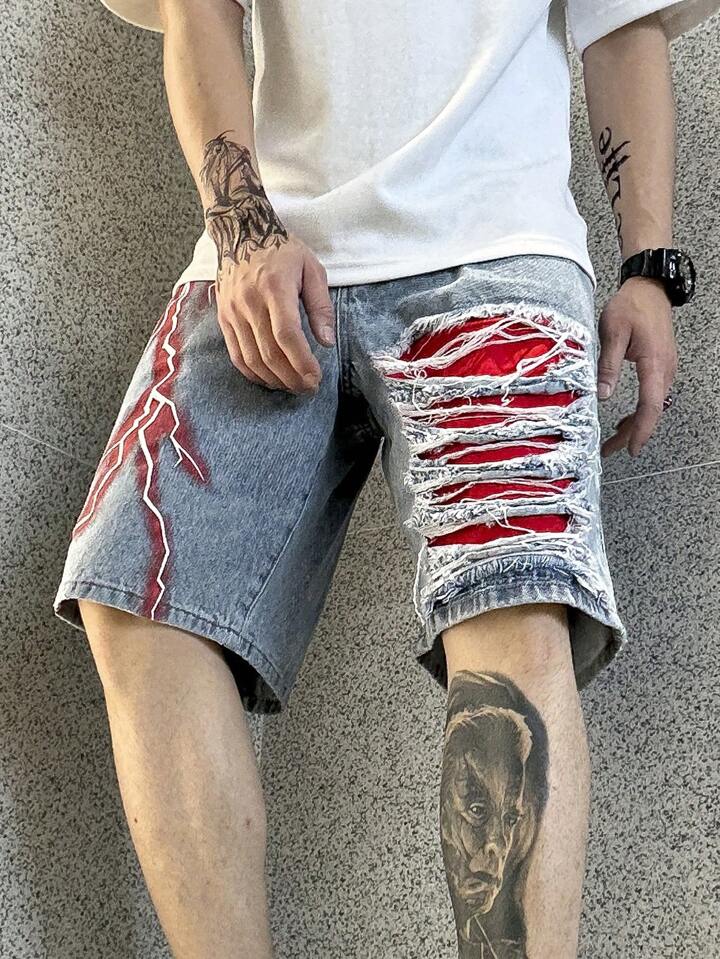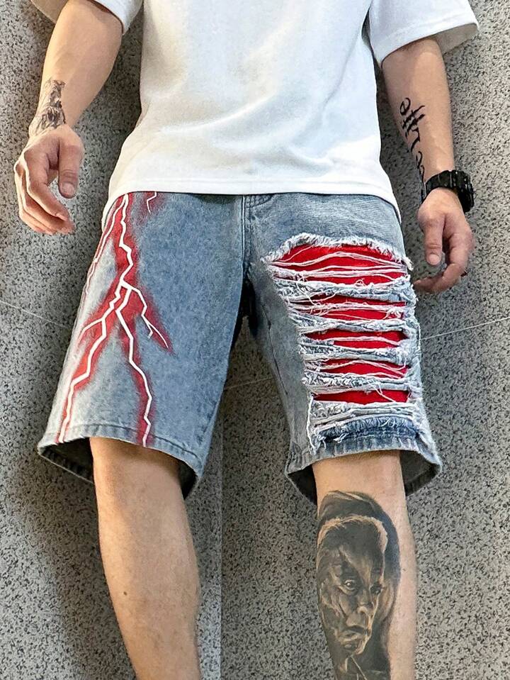 Zerrissene Herren Baumwolle Denim Shorts mit Blitz Print