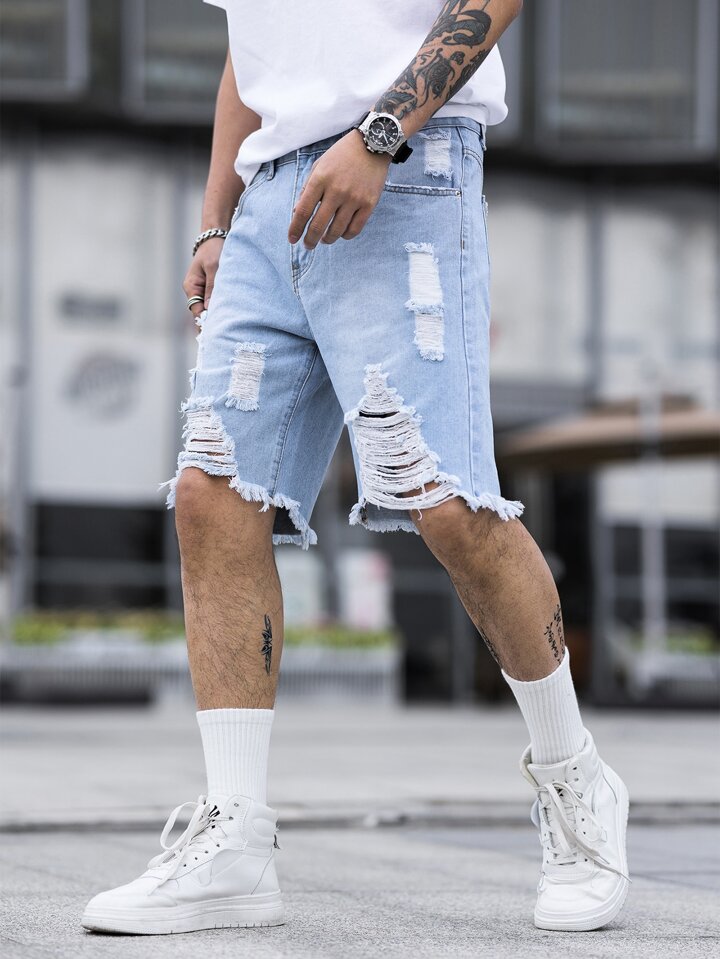 Männer Baumwolle zerrissene ausgefranste rohe Saum Bermuda Denim Shorts Baggy-Jorts Einfarbig Hellblau Going-out-Mode