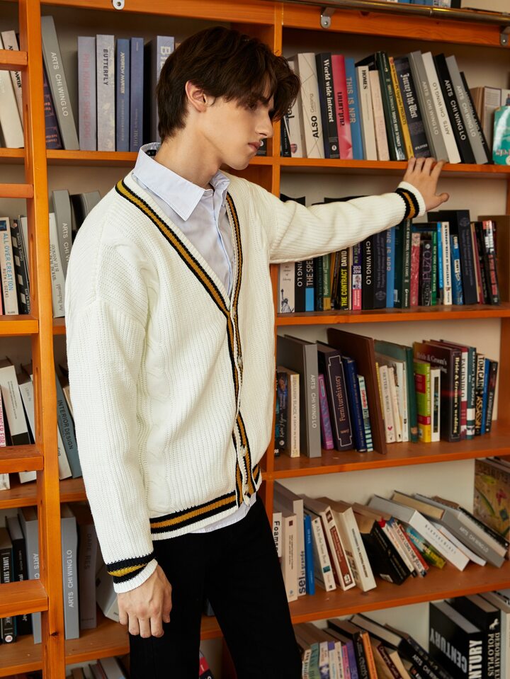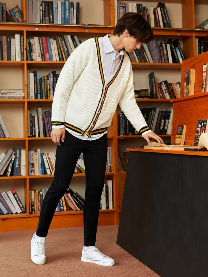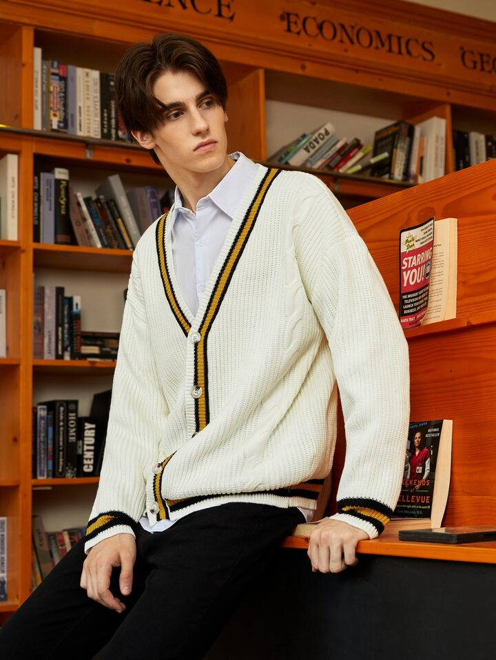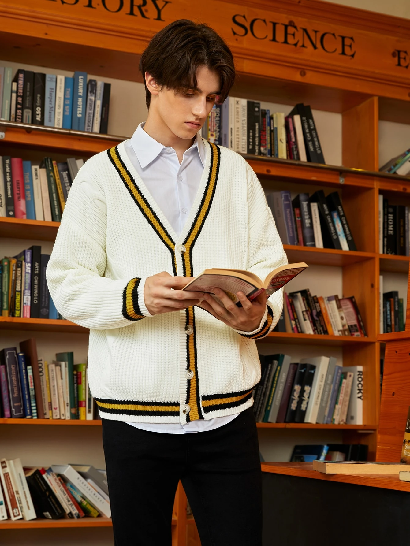 Einreihige Strickjacke mit gestreiftem Besatz ohne Hemd