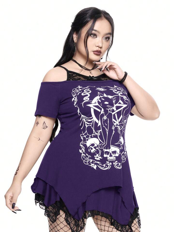 Gyaru Sommer Strand/Konzert, Rave Festival Streetwear. Gothic-Stil mysteriöse Katze, Stern, Skelett Muster asymmetrisches Schulter Kontrast Spitze Große Größen T-Shirt