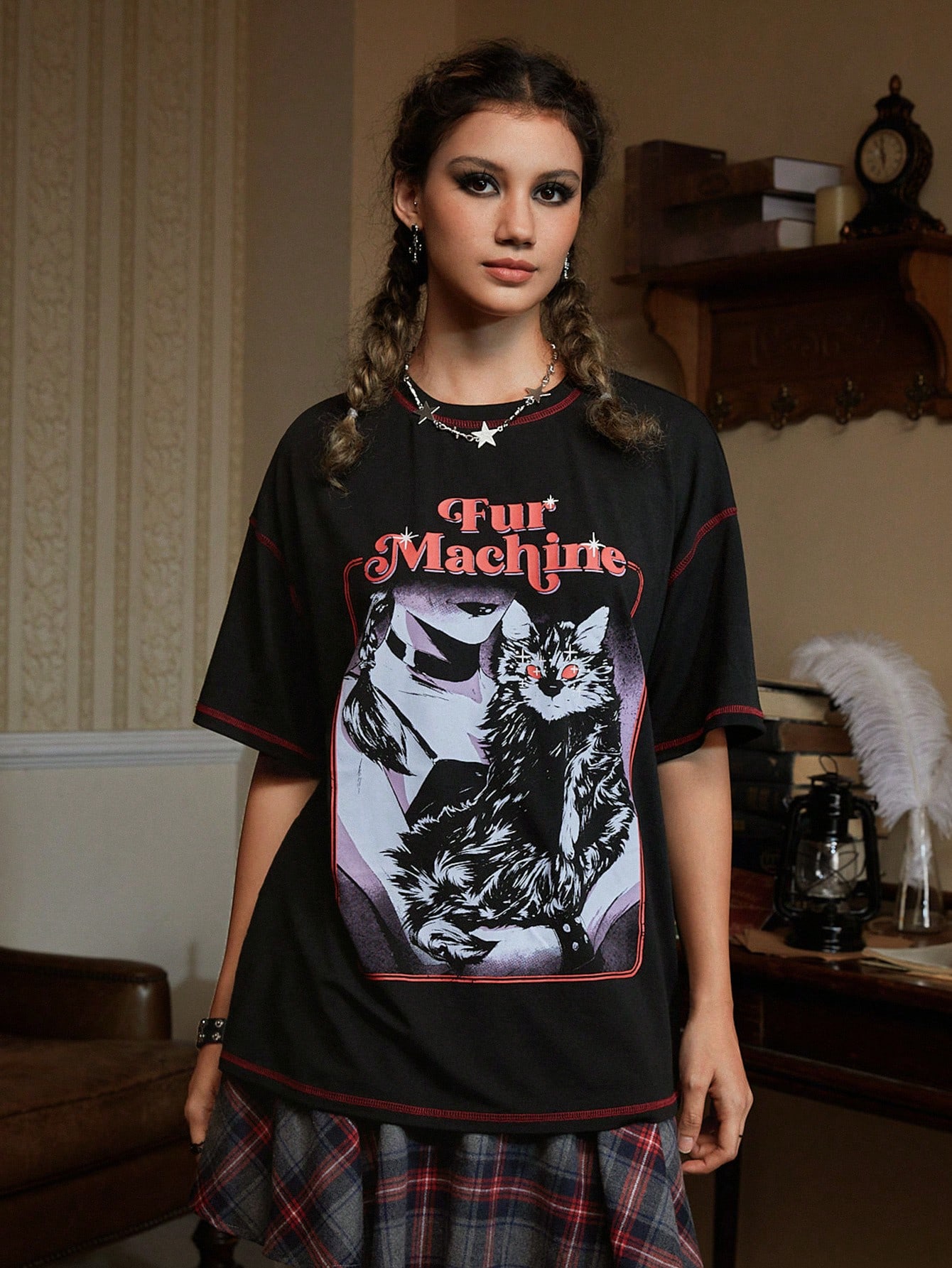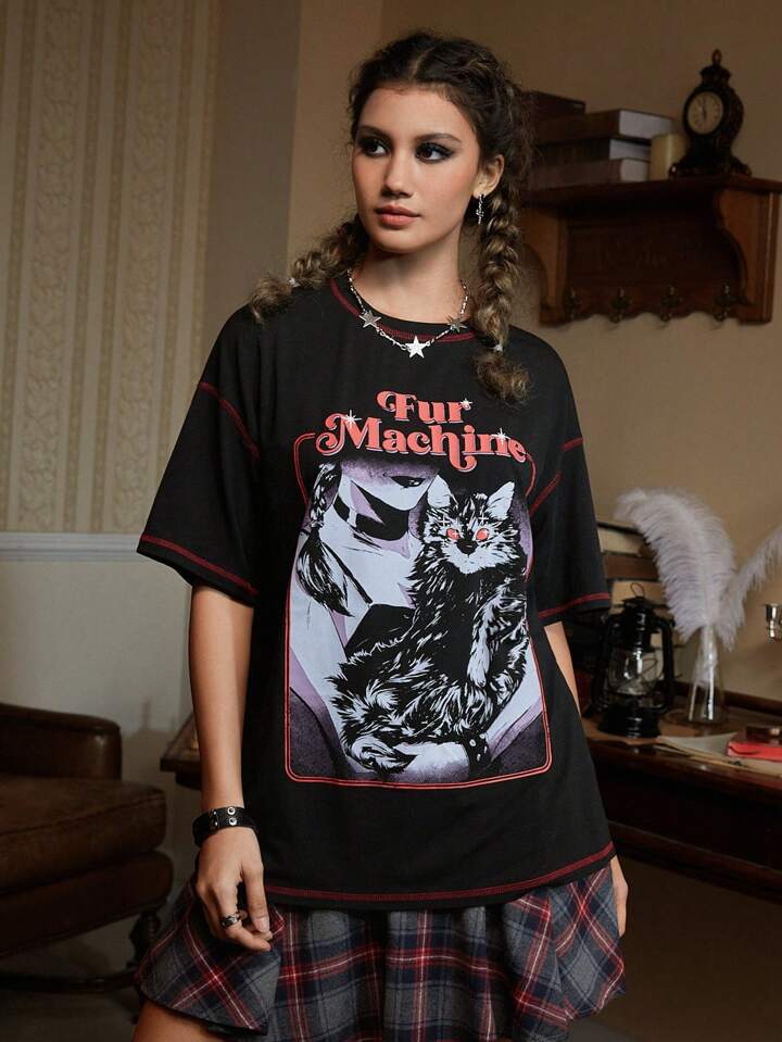 Hafaell Drop Shoulder T-Shirt mit Katze Muster, Absteppen,