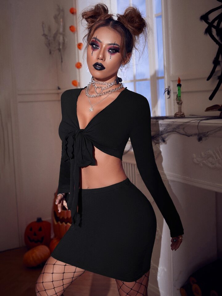 Crop Top mit Halloween Muster, Knoten & Rock