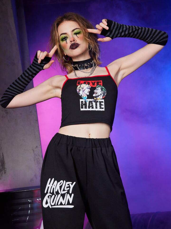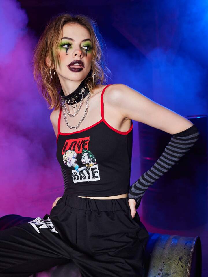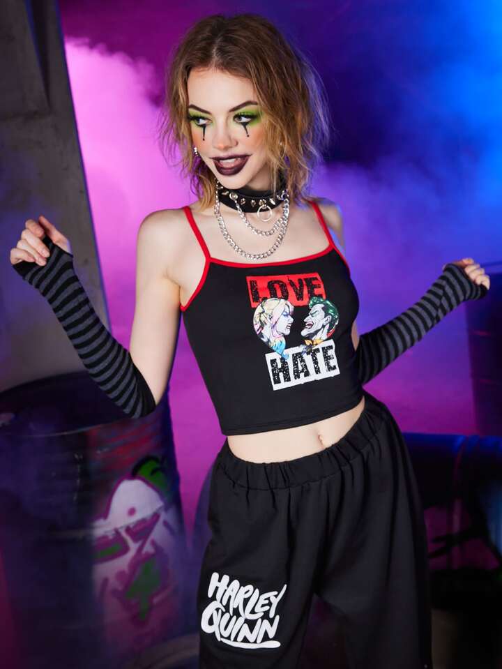 Harley Quinn | ROMWE Crop Cami Buchstabe Figur Grafik, Kontrastsaum