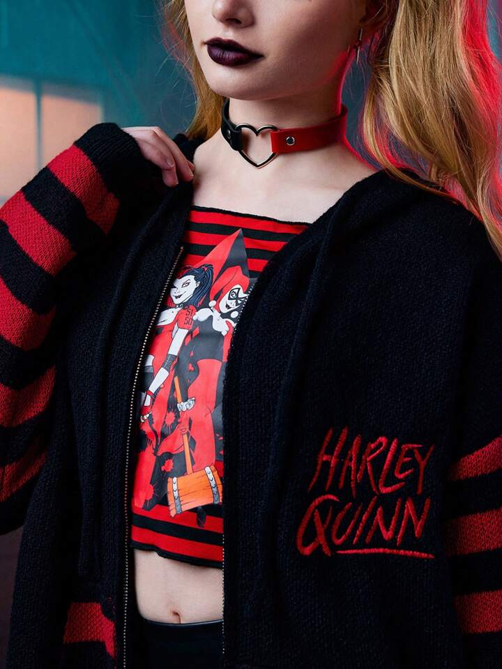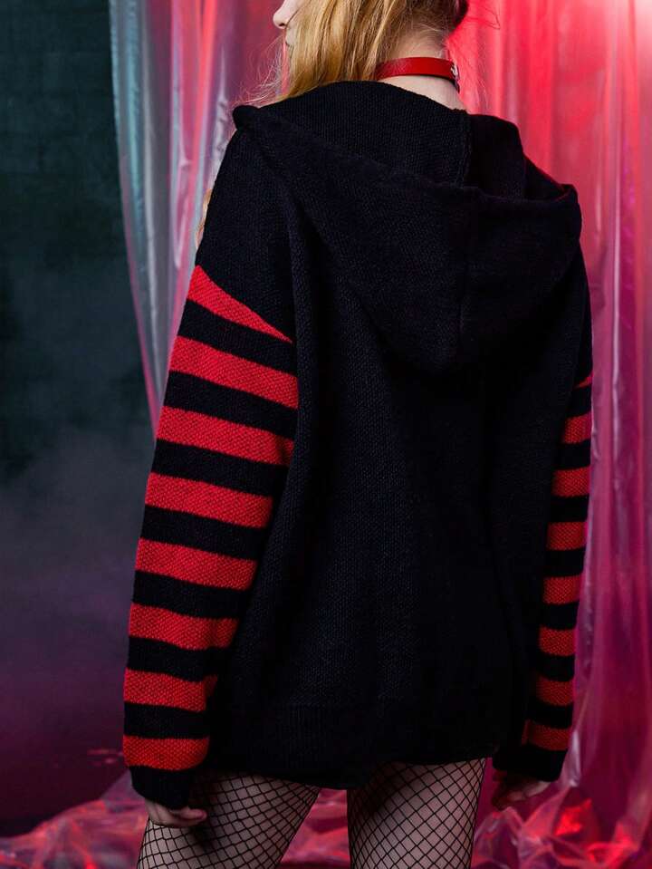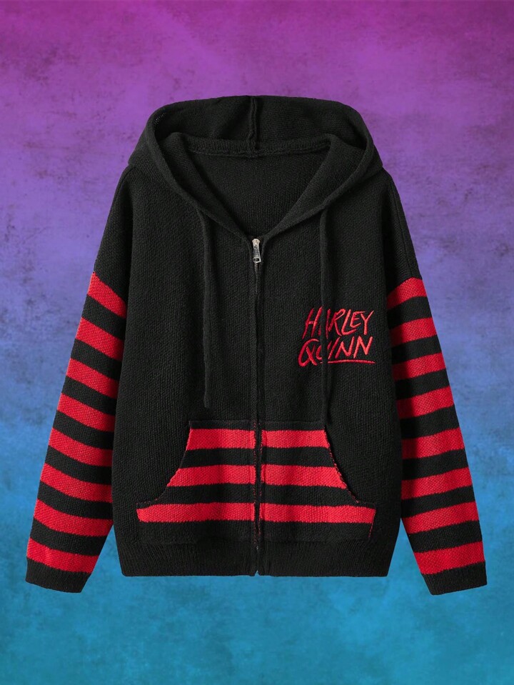 Harley Quinn | ROMWE Drop Shoulder Kapuzen Cardigan mit Streifen und Buchstabenmuster und Reißverschluss