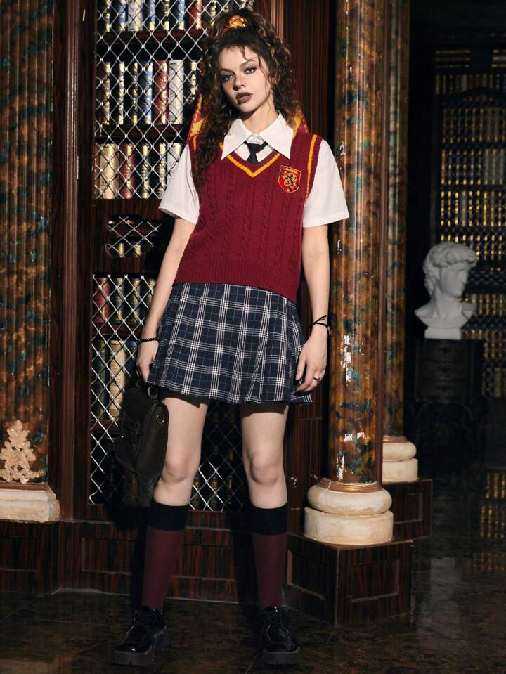 Harry Potter | ROMWE Gestreifter Pullunder ohne Bluse mit Cartoon Muster, Schule