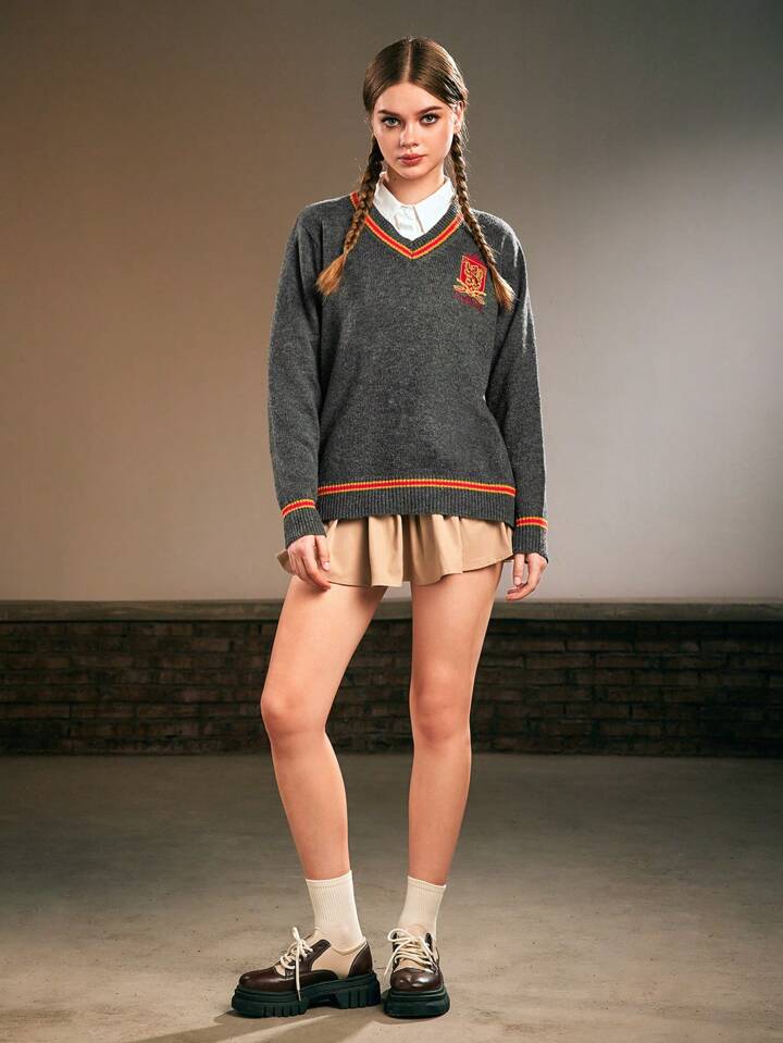 Harry Potter | ROMWE Pullover Mit Gestreiftem Rand, Übergroßer Pulli Mit Besticktem V-ausschnitt