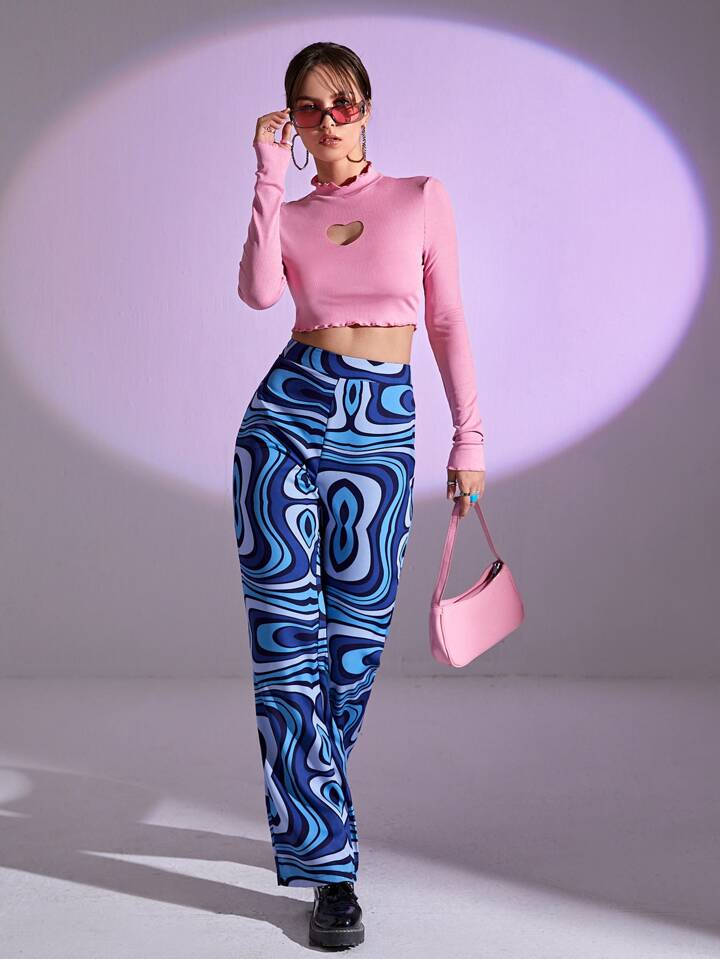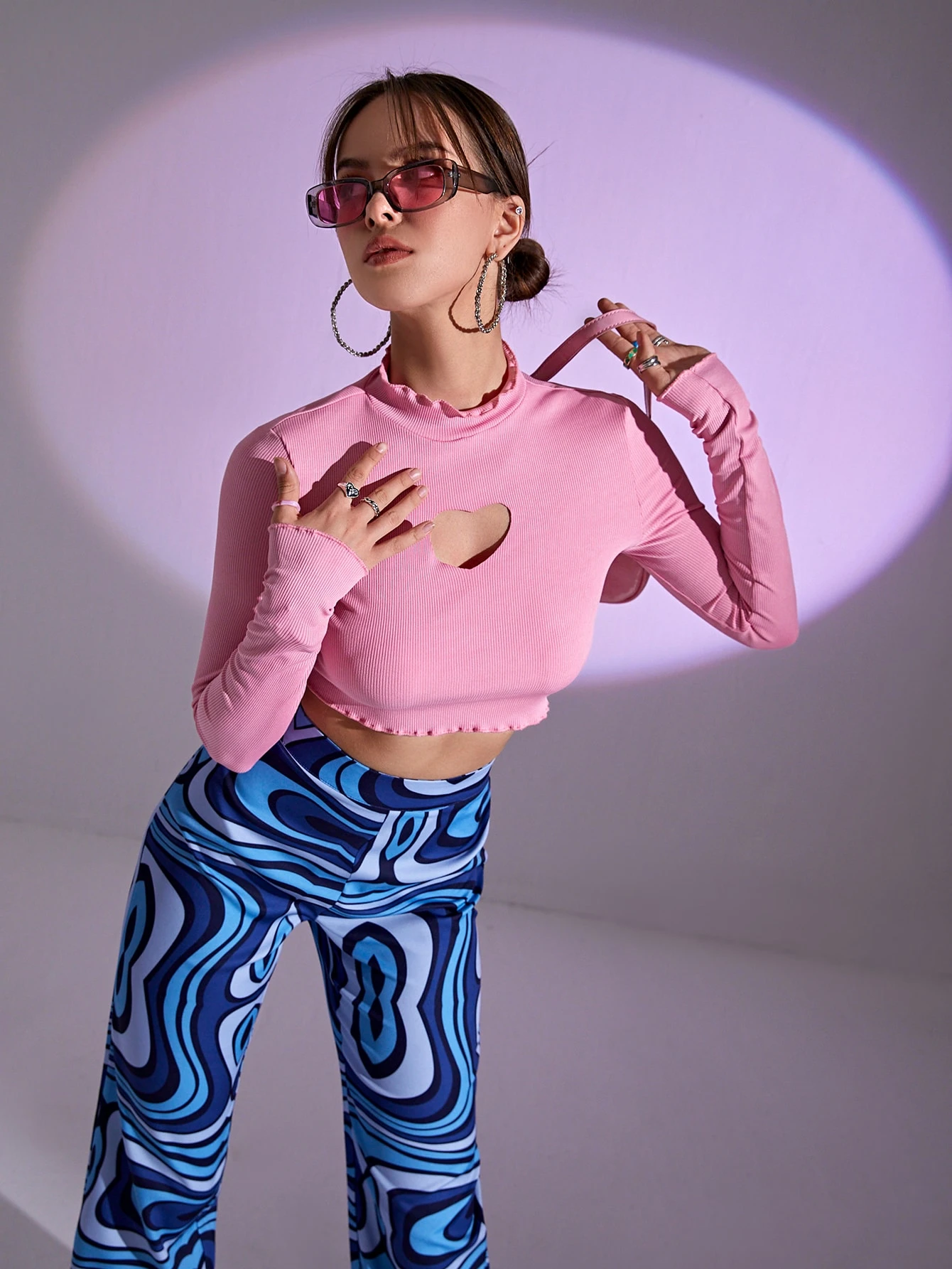 Crop T-Shirt mit Herz Ausschnitt, Wellensaum