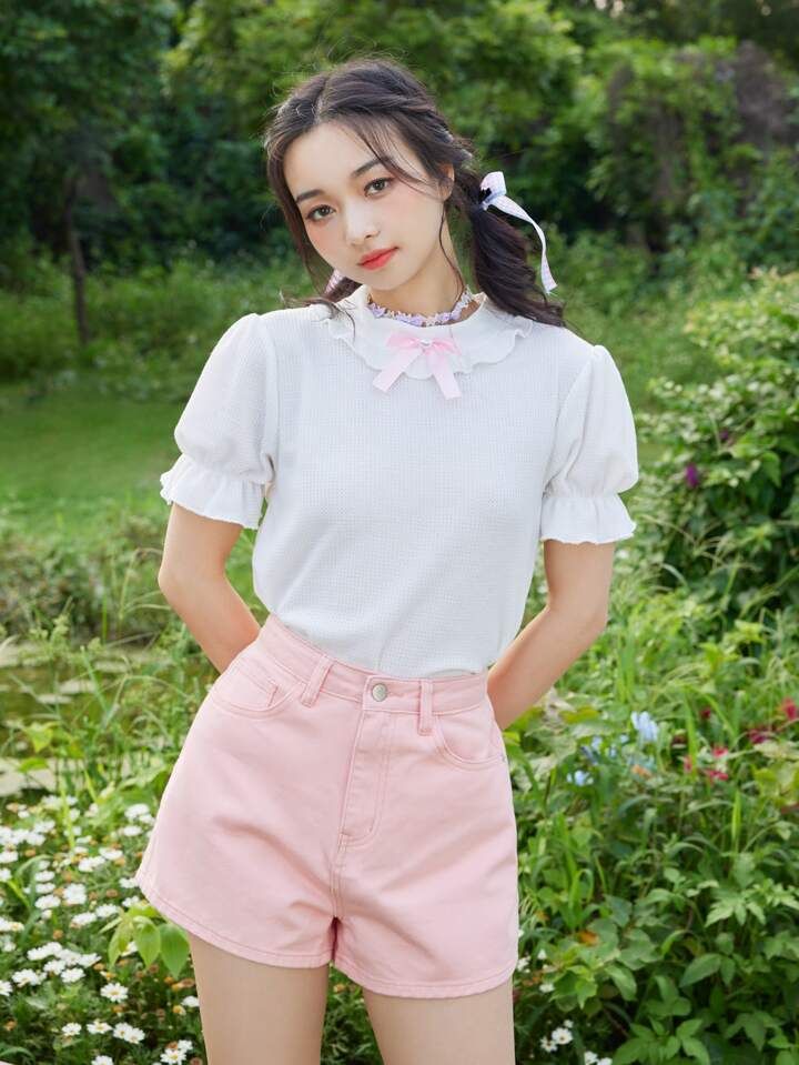 Denim Shorts mit Herz Muster, Kontrast Spitzen