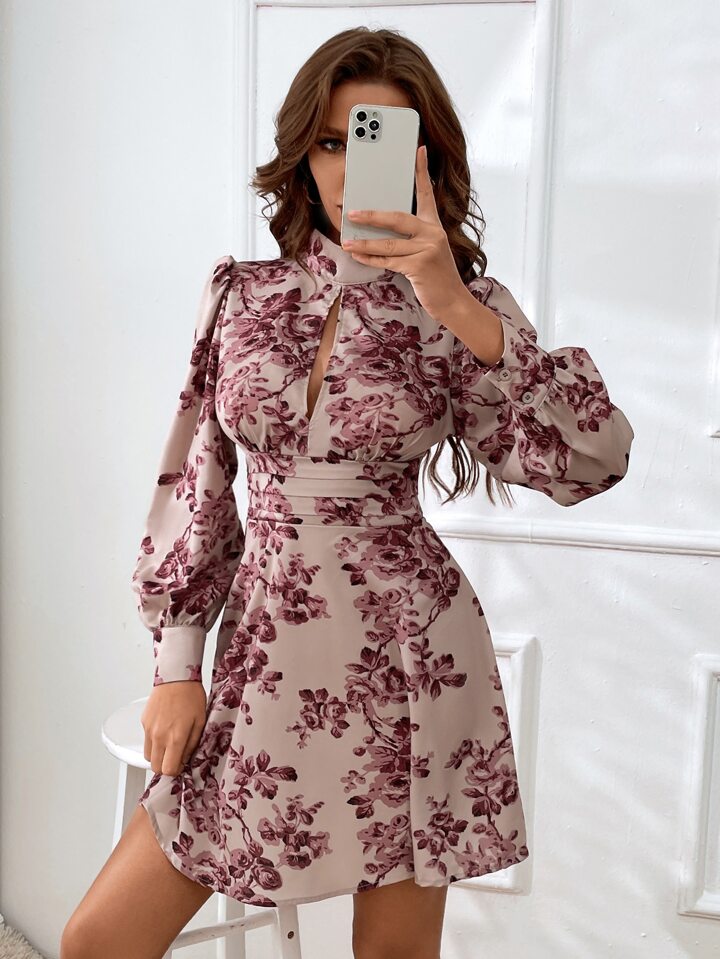 Hochgeschlossenes rosa Blumenkleid mit Puffärmeln, vorderem Schlitz und Falten auf der Taille
